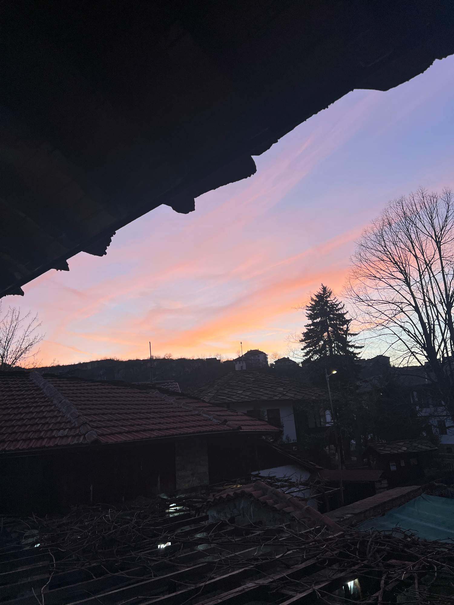 The image, rotated 90 degrees counter-clockwise, shows a dusk scene in Lovech, Bulgaria. In the foreground, there's a silhouette of a building roof on the left. On the right, there's a building withβ¦read more