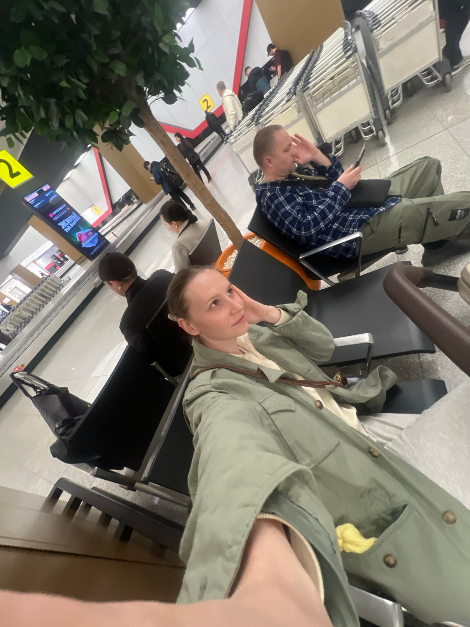 The image depicts two individuals in a waiting area. One person, wearing a blue plaid shirt and green pants, is sitting and looking at a tablet. The other person, dressed in a green jacket, is sitting…read more