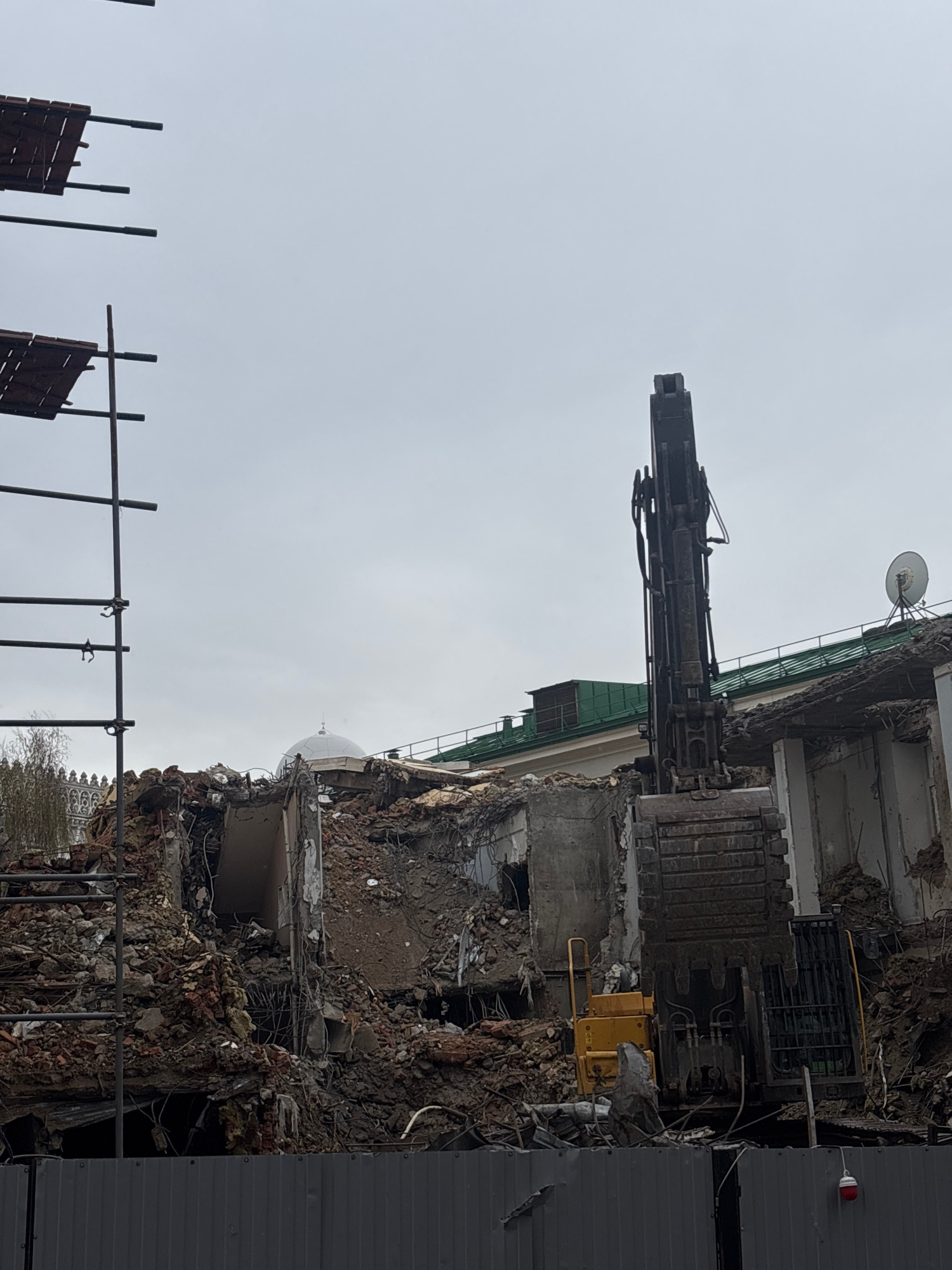 The image shows a demolition site in Moscow, Russia. A large building is partially destroyed, with rubble scattered around. A demolition excavator with a long boom is positioned on top of the remainin…read more