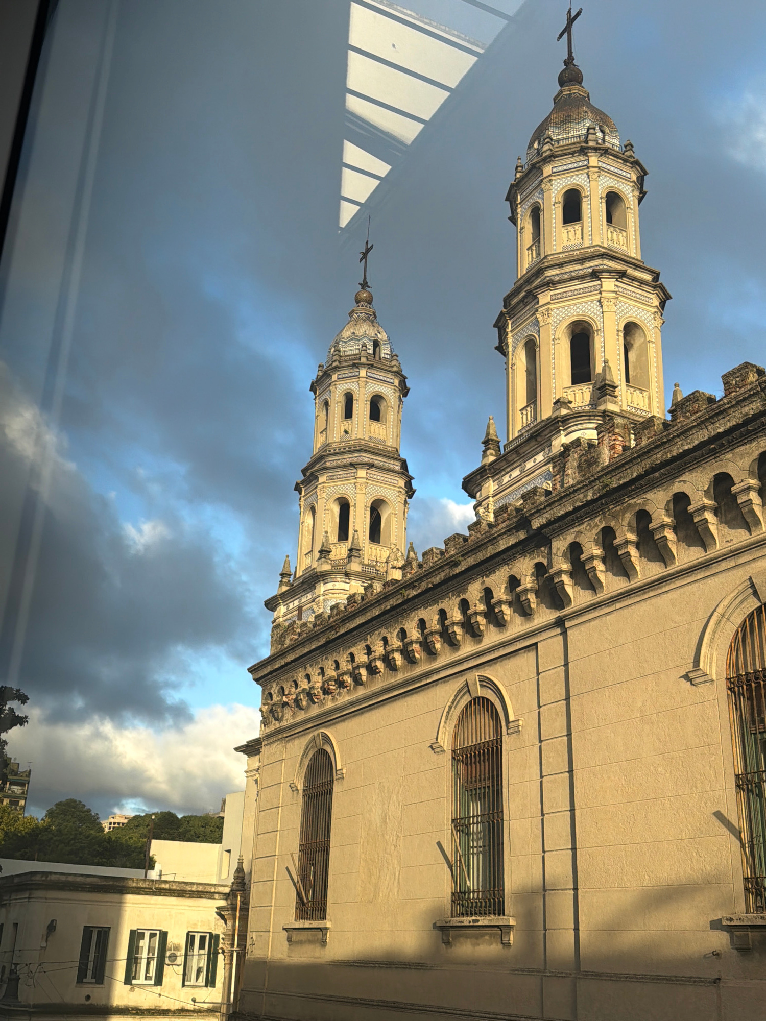 The image captures a grand, ornate building, likely a church or cathedral, featuring two prominent bell towers. The architecture is characterized by a light, warm-toned facade adorned with intricate d…read more