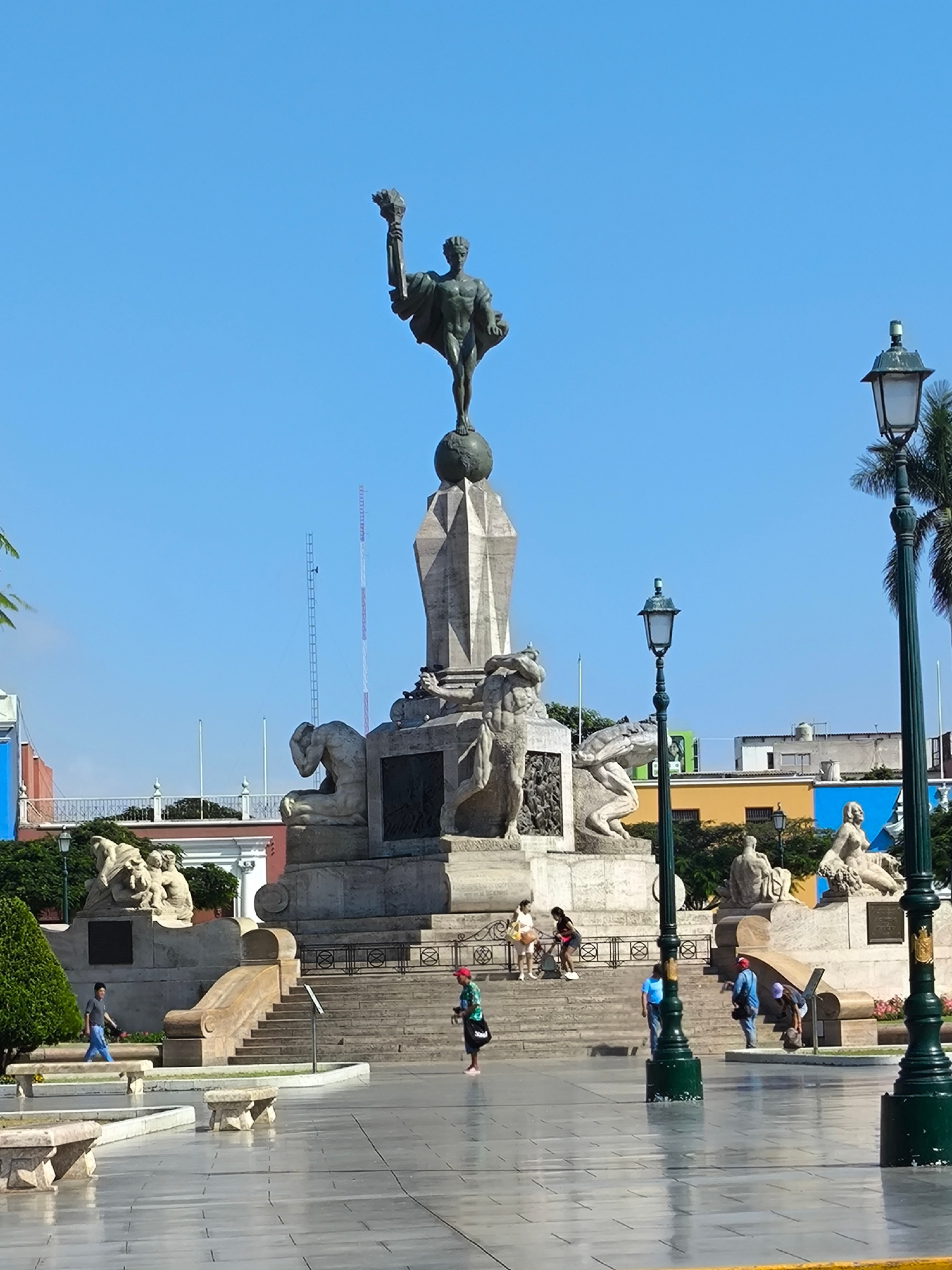 The image shows the Plaza de Armas in Trujillo, Peru, with the Freedom Monument as the central focus. The monument features a man standing atop a globe, holding a torch aloft. The base of the monument…read more