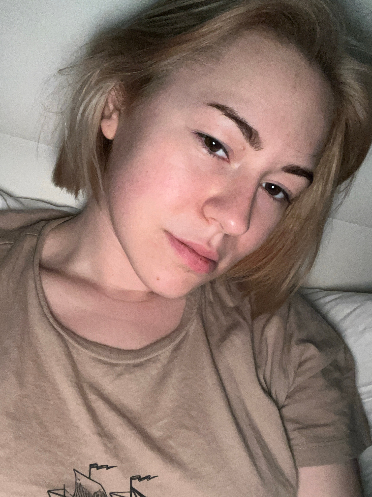 A young woman with short, blonde hair and brown eyes is lying down, likely on a bed, as suggested by the white pillow visible in the background. She is wearing a brown t-shirt with a black graphic des…read more