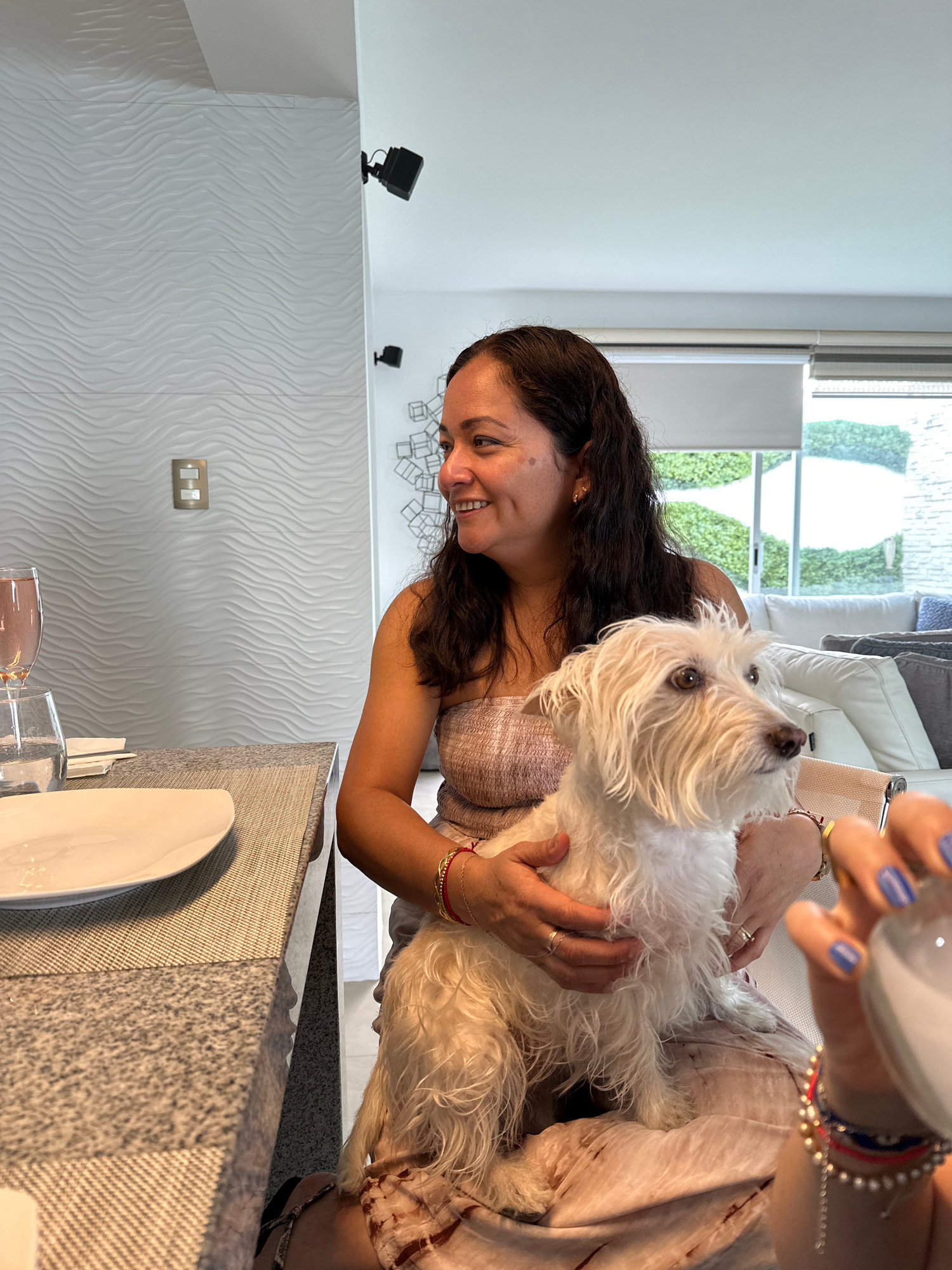 A woman with long dark hair and a light complexion is smiling while holding a small, white, fluffy dog. She is wearing a light-colored, patterned top and bracelets on her right wrist. The dog is looki…read more