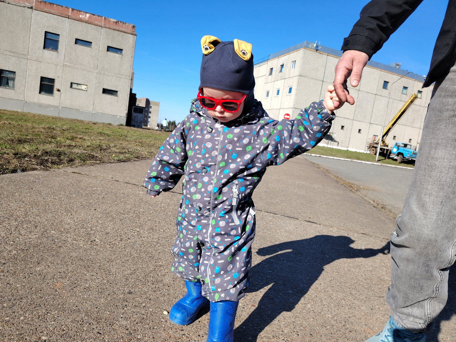 A small child, likely a toddler, is captured walking outdoors on a bright, sunny day, holding the hand of an adult. The child is dressed in a dark grey full-body jumpsuit adorned with blue, green, and…read more