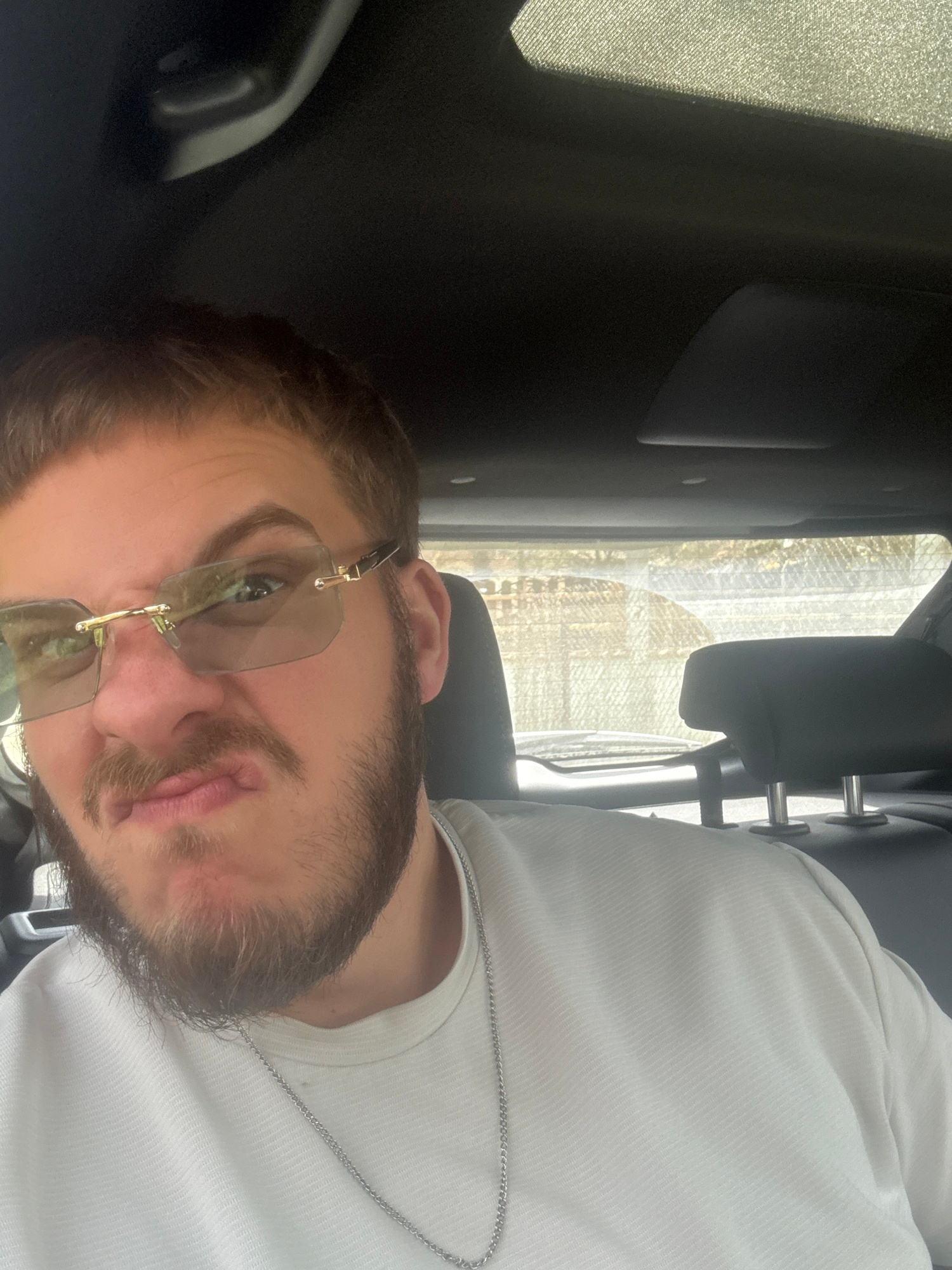 A selfie, oriented sideways, shows a man with brown hair, a beard, and gold-framed sunglasses. He is wearing a white shirt and a silver chain around his neck. The photo appears to have been taken insi…read more