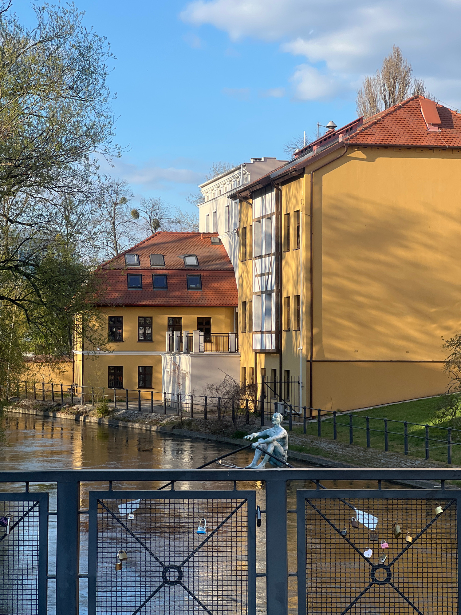 The image shows a view from a bridge over the Brda River in Bydgoszcz, Poland. The river flows between buildings of yellow and white stucco. The bridge railing is visible in the foreground, and it fea…read more