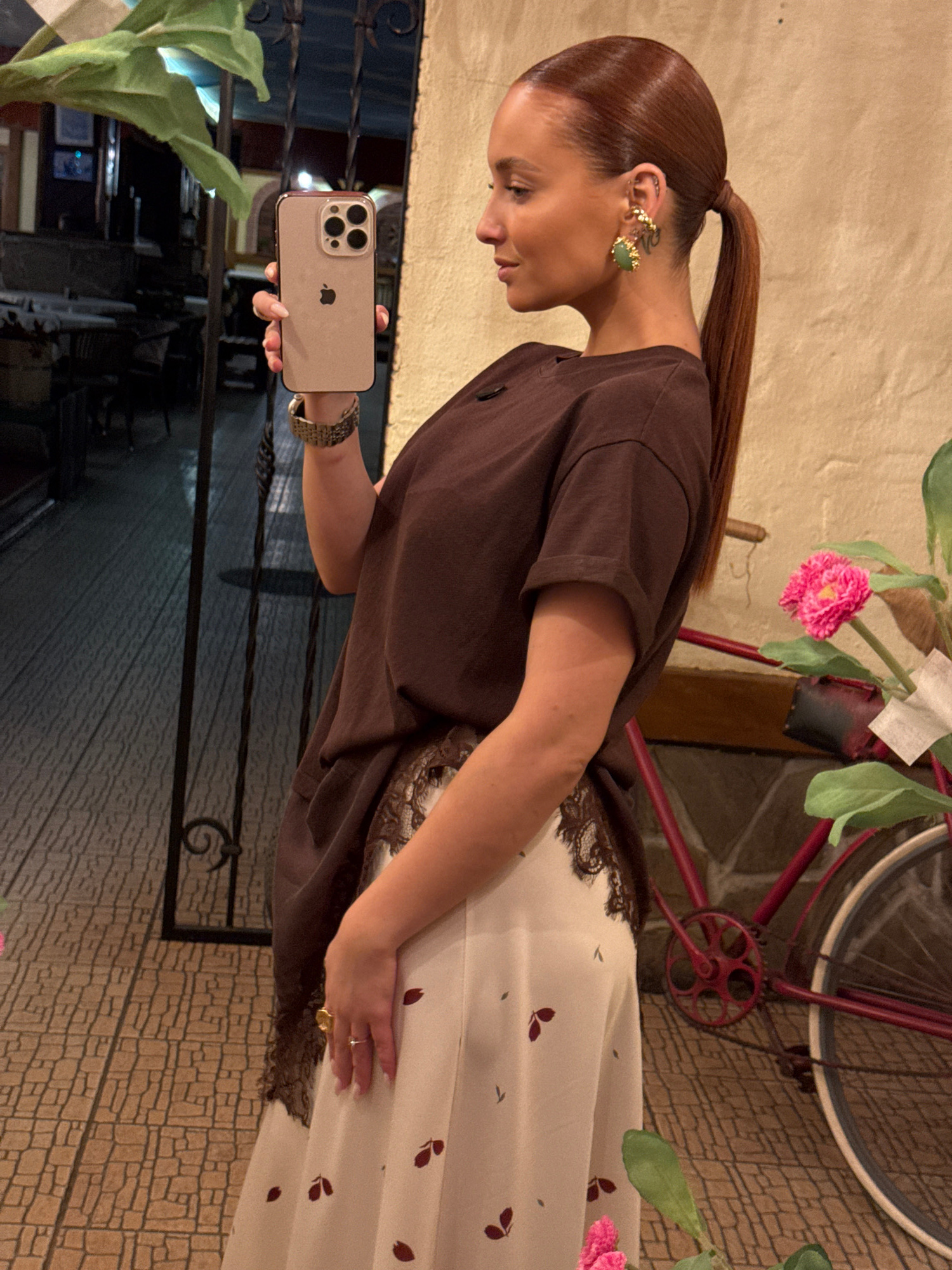 A woman with reddish-brown hair pulled back into a ponytail is holding a gold iPhone 14 Pro and is positioned indoors, possibly in a cafe or restaurant. She is wearing a brown, loose-fitting top and a…read more