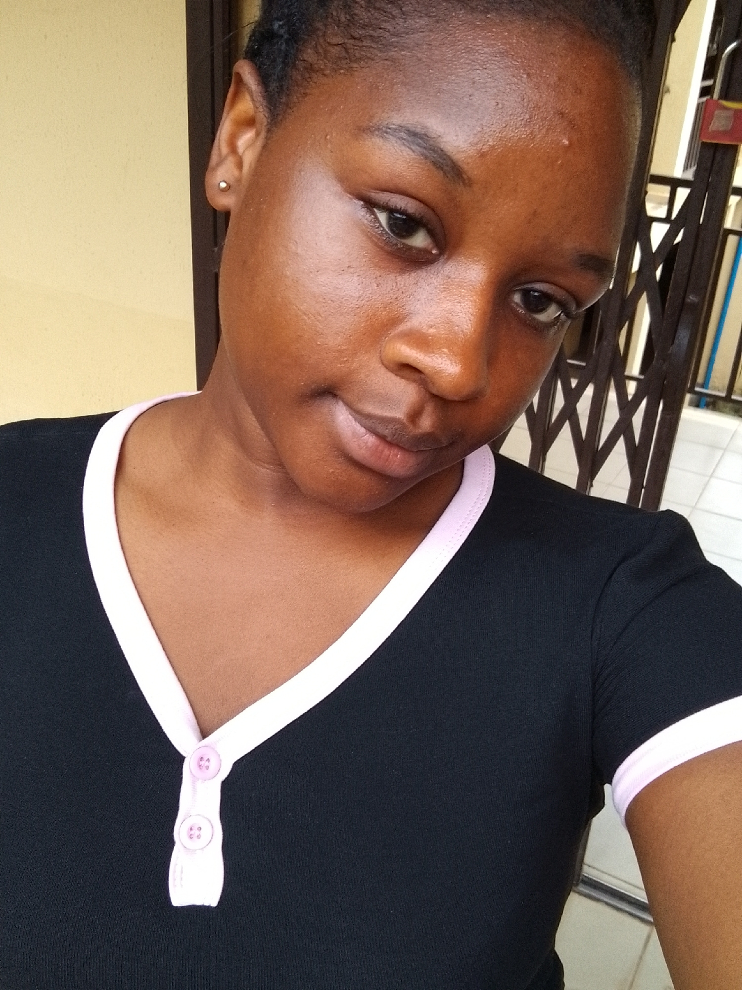 A close-up shot depicts a person with dark skin wearing a black v-neck shirt with pink trim and two light pink buttons. The person has a small stud earring in their left ear. A tan-colored wall is vis…read more