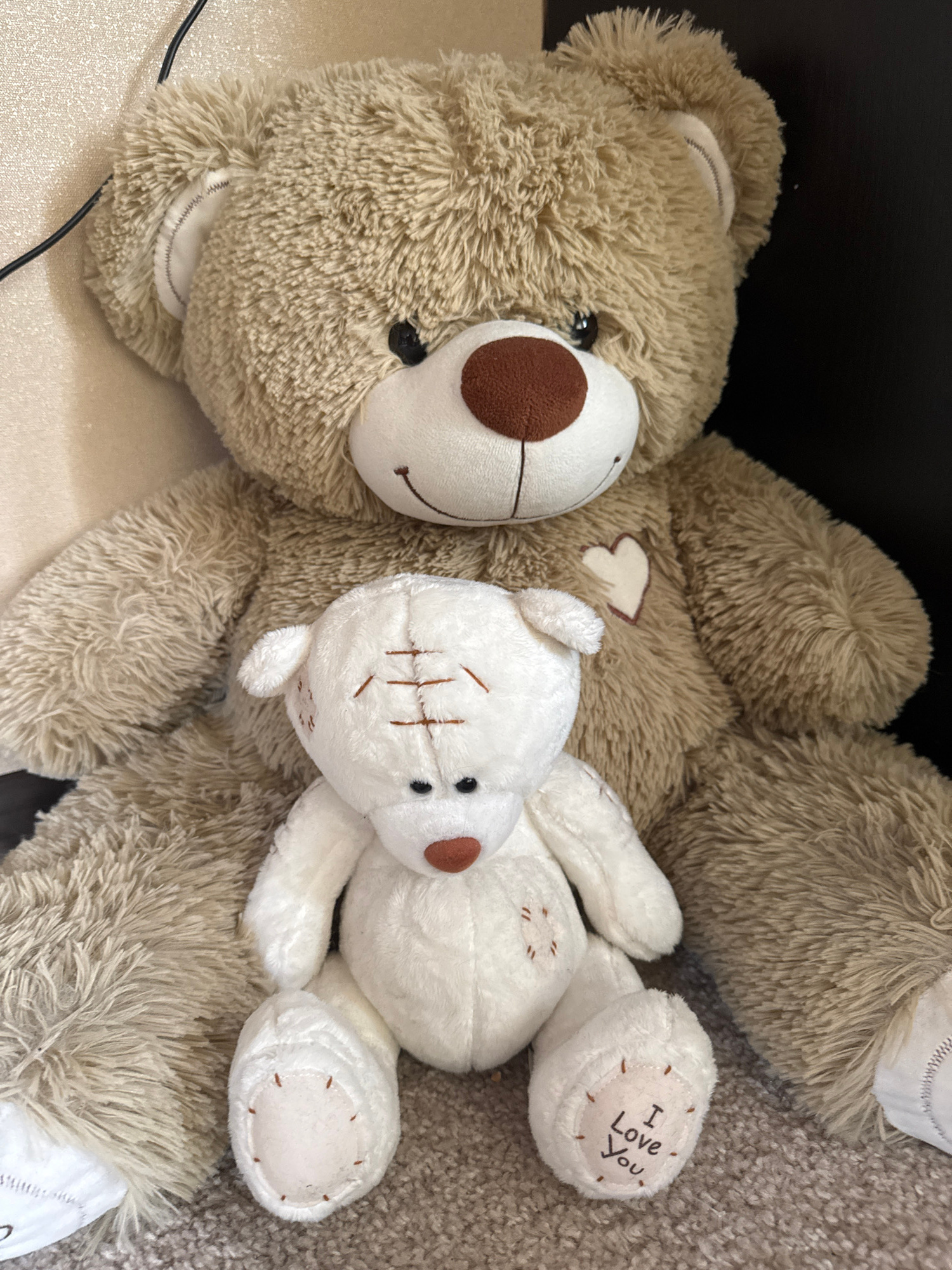 A light brown, fluffy teddy bear is lying on a textured, gray surface. A smaller, white teddy bear is lying on top of the larger bear. The small teddy bear has brown stitches for its mouth and a brown…read more