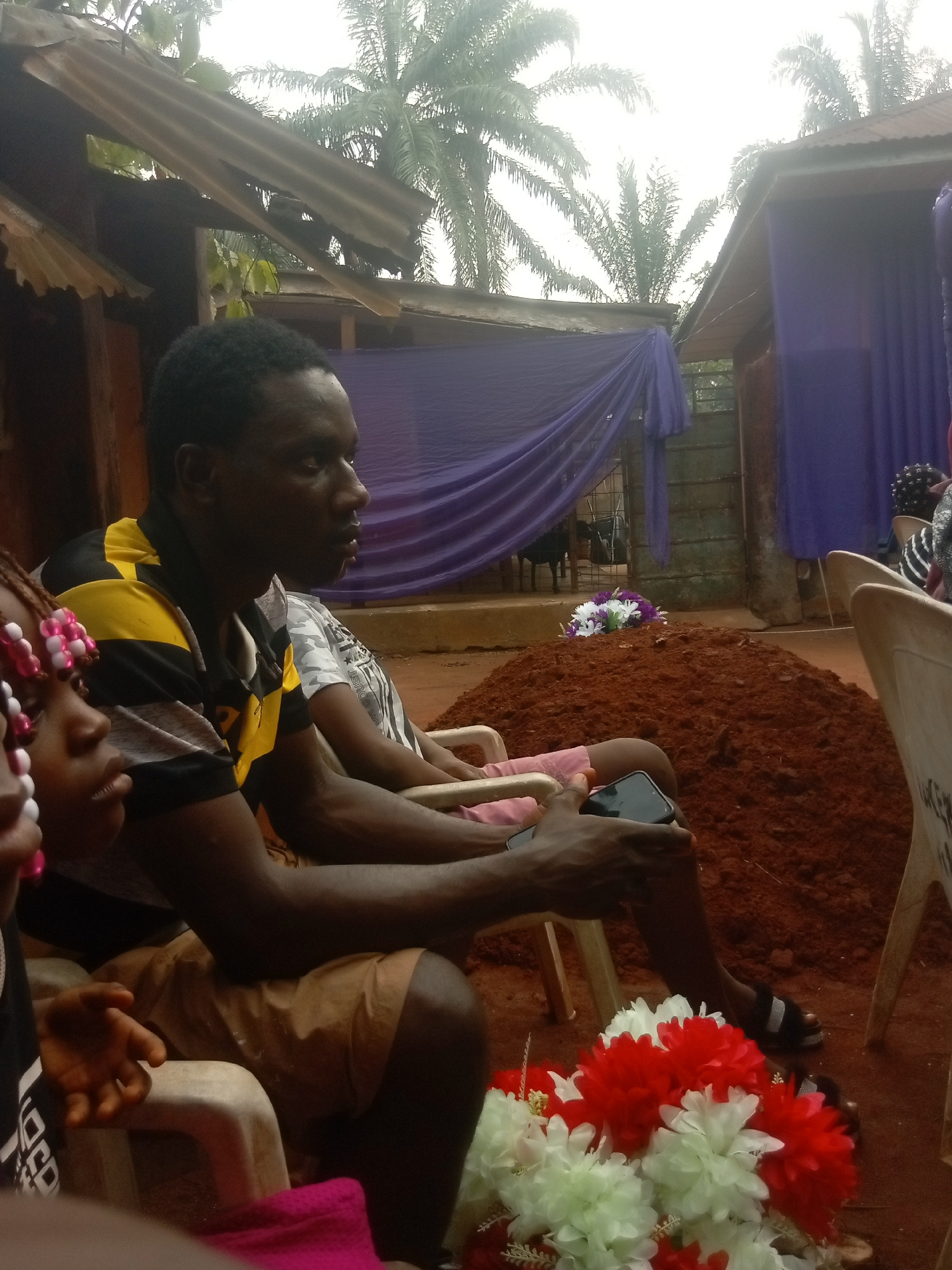 The image shows an outdoor scene in what appears to be Igbo-Ukwu, Nigeria. A freshly dug grave mound of reddish-brown soil is centrally positioned. In the foreground, a man is sitting on a plastic cha…read more