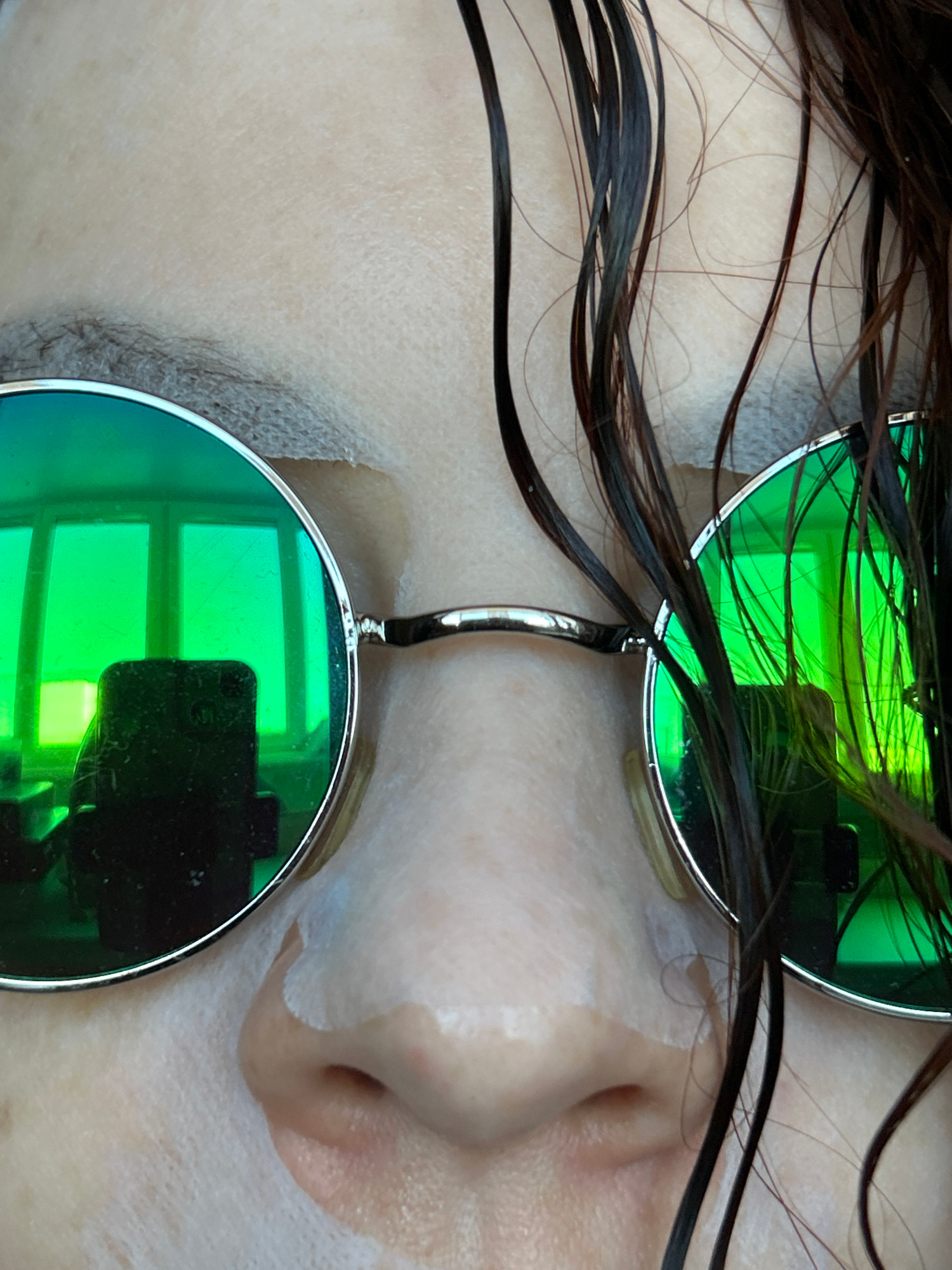 A close-up shows a person's face covered with a white sheet mask and wearing round, green-tinted sunglasses. Wet, dark hair is draped across the face. The sunglasses reflect a window and a dark object…read more