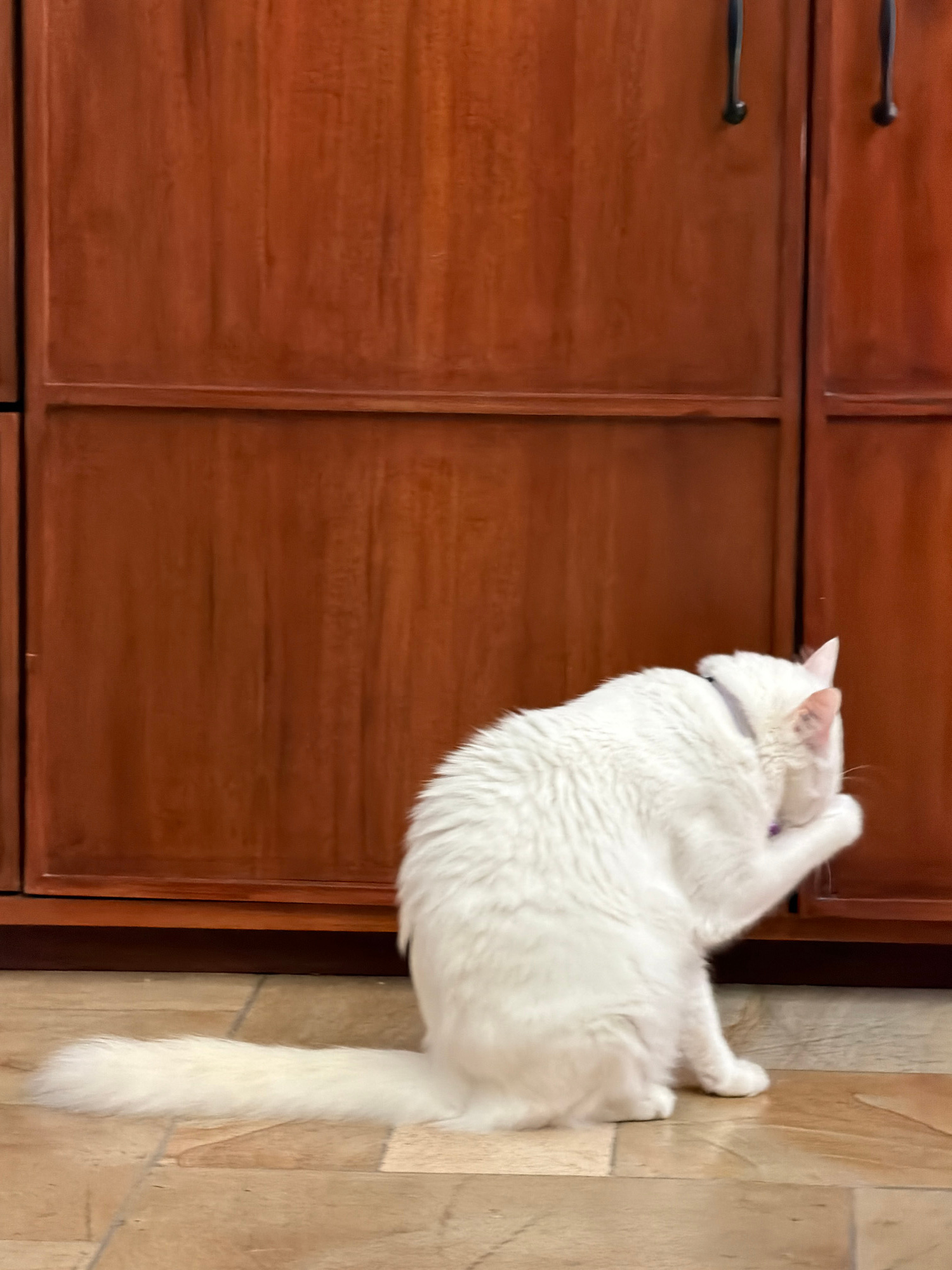 A full-bodied white cat is situated on the right side of the image, adjacent to a reddish-brown wooden dresser on the left. The cat is grooming, with one paw raised towards its face. The cat's tail ex…read more