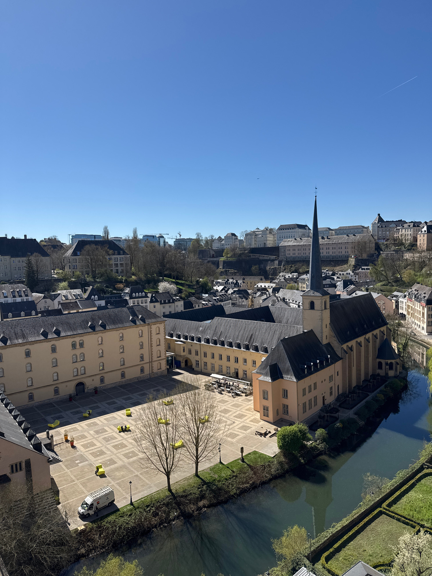The image shows a portion of Luxembourg City, Luxembourg. A river or canal runs along the right edge, bordered by grass and trees. Adjacent to the river, a large square paved with a geometric pattern…read more