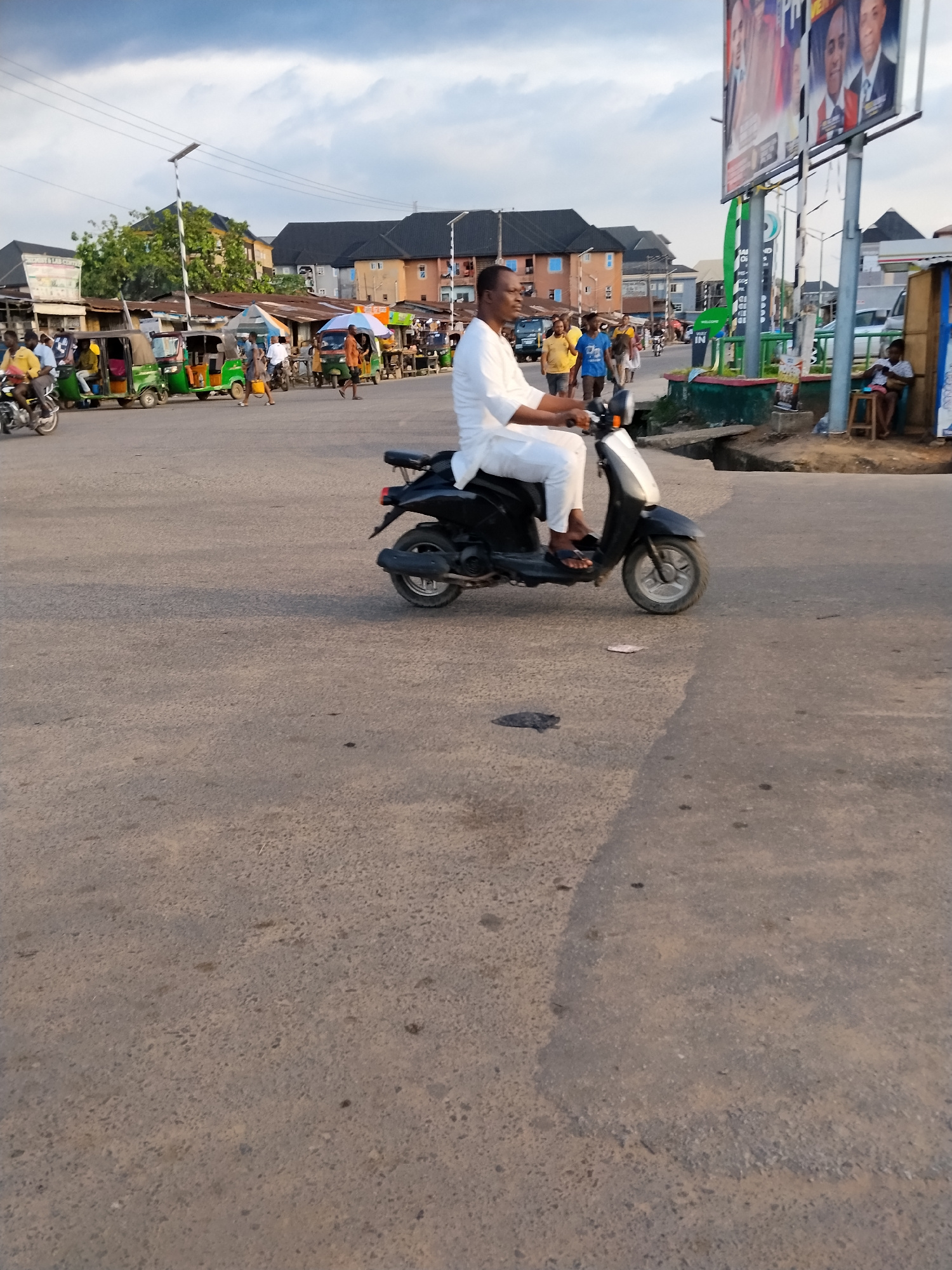 The image depicts a man in white attire riding a black scooter on a paved road in Aba, Nigeria. He is heading toward the right side of the frame. In the background, there are various buildings, commer…read more