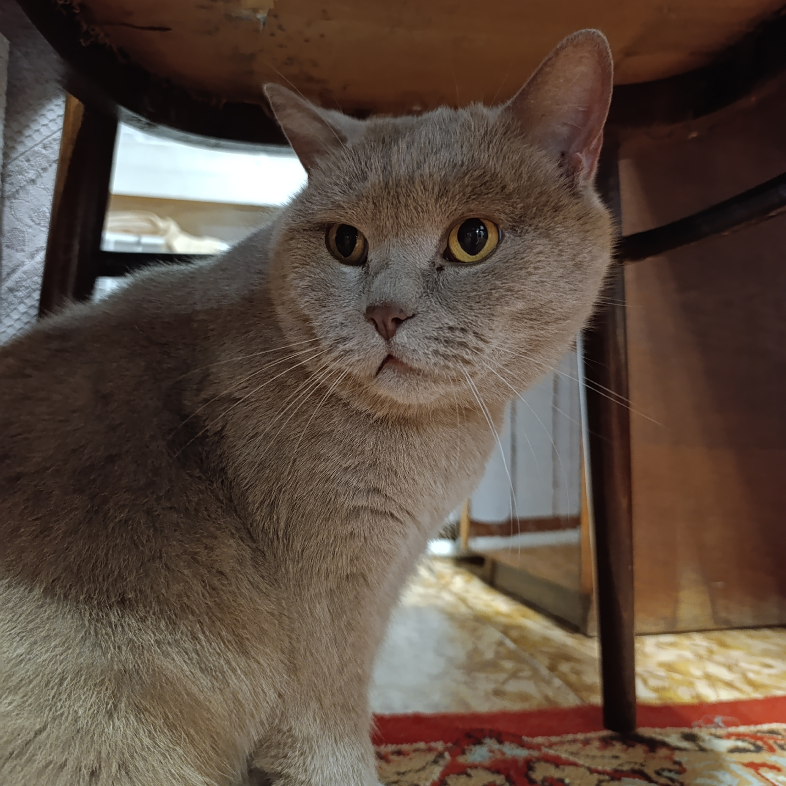 A gray-brown cat with yellow eyes is under a wooden chair. The cat is positioned towards the left of the frame. The floor has a patterned rug with red and beige colors. The location is Dubovaya, Russi…read more
