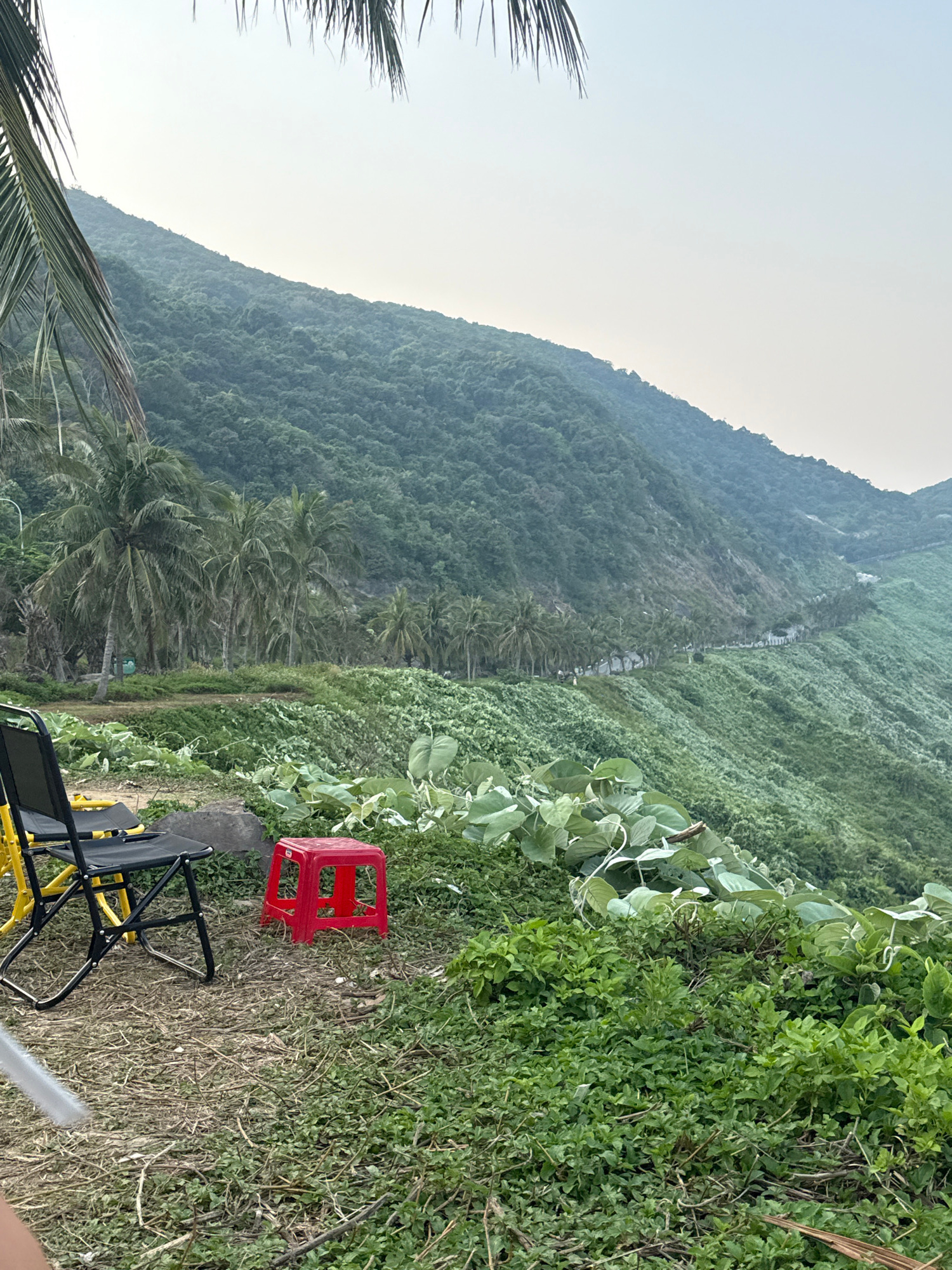 The scene is a hillside view in Đà Nẵng, Vietnam. A steep, densely forested mountain rises to the left. A line of palm trees grows at the base of the mountain, transitioning into dense vegetation on t…read more