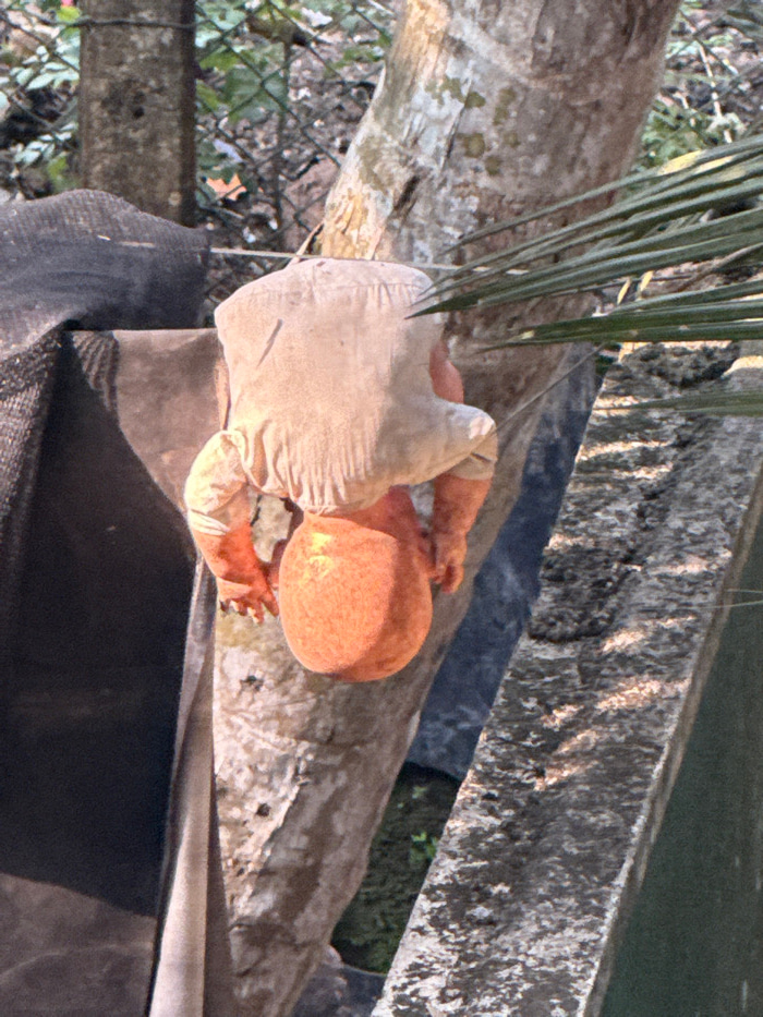 The image displays a baby doll, characterized by orange-pink skin on its head, arms, and hands, suspended upside down. The doll wears a light-colored, possibly beige or off-white, long-sleeved garment…read more