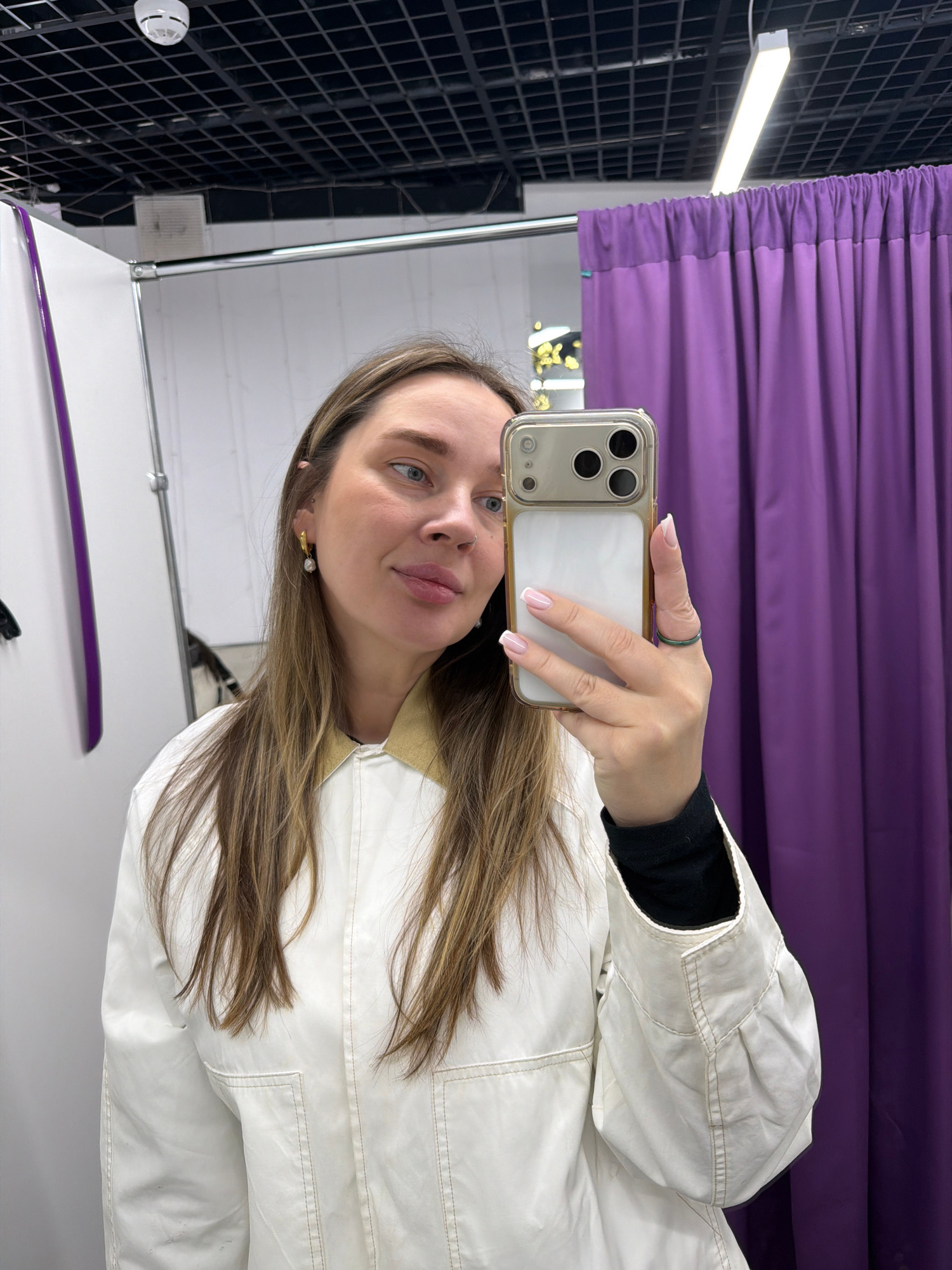 A woman is taking a selfie in what appears to be a dressing room. She is holding a smartphone with a visible camera array. The background includes a purple curtain and a black metal grid structure, po…read more