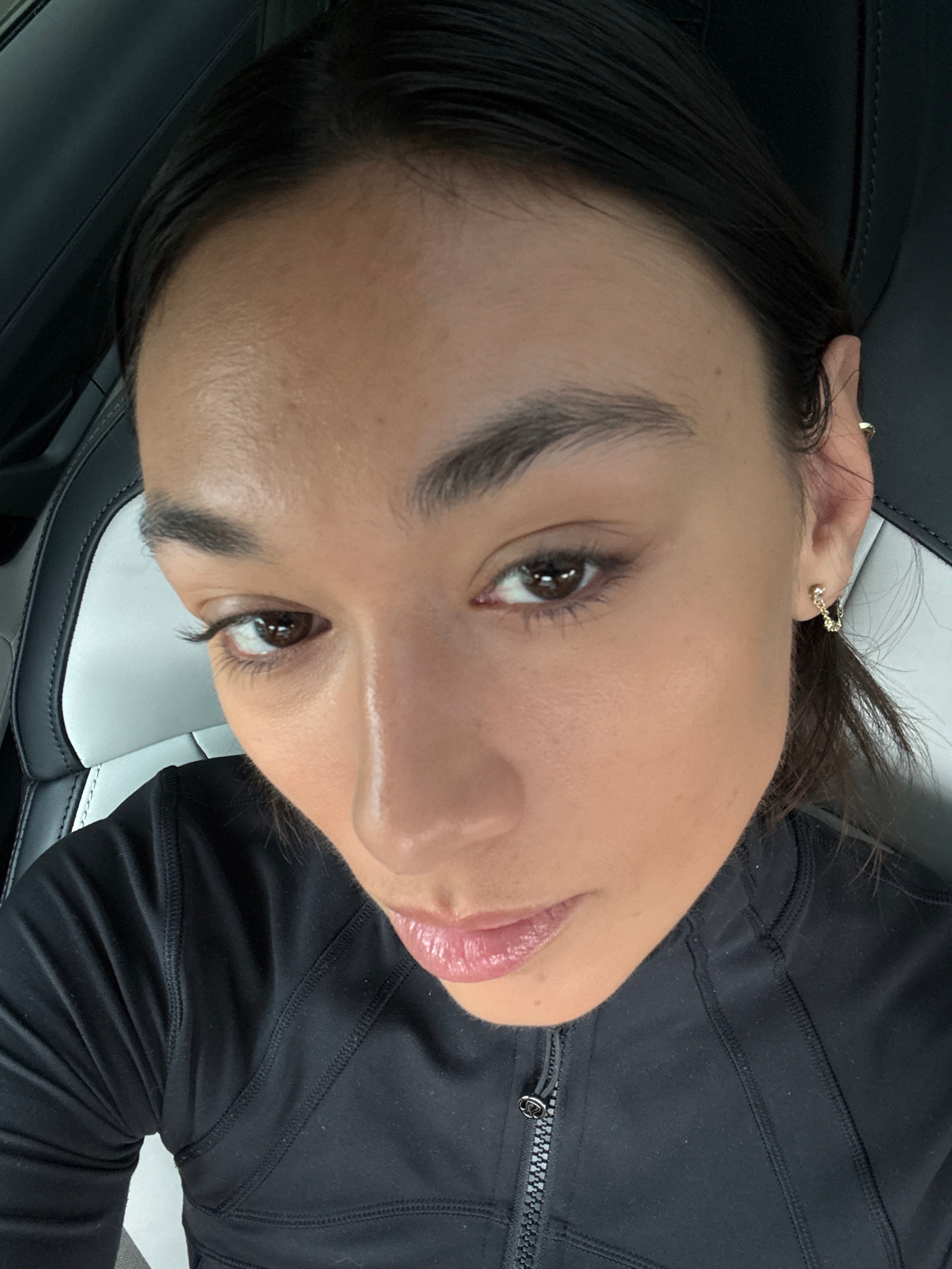 A close-up shot depicts a woman with brown eyes, dark hair, and fair skin, positioned in what appears to be a car seat. She is wearing a black, possibly athletic, top with a visible zipper. The car's…read more