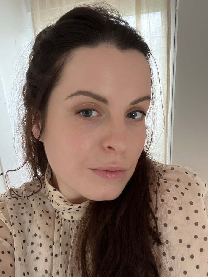 The image displays a head and upper torso portrait of a single individual, a female, in an indoor setting. The subject has fair skin, dark brown hair partially styled back from the forehead with some…read more