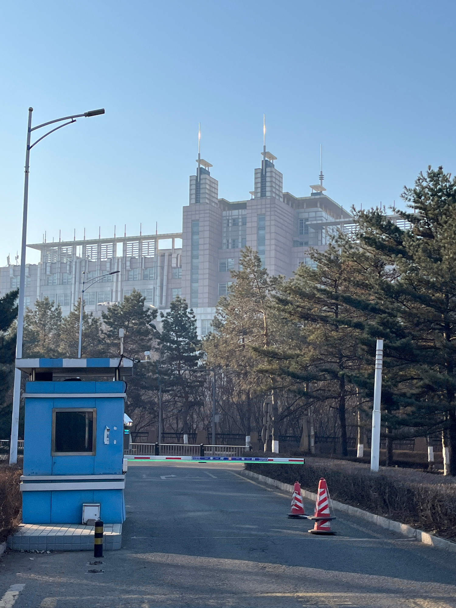 The image depicts an entrance to a property or facility in Changchun City, China. A small, light blue guard booth sits adjacent to an asphalt road. A gate arm, likely for controlling vehicular access,…read more