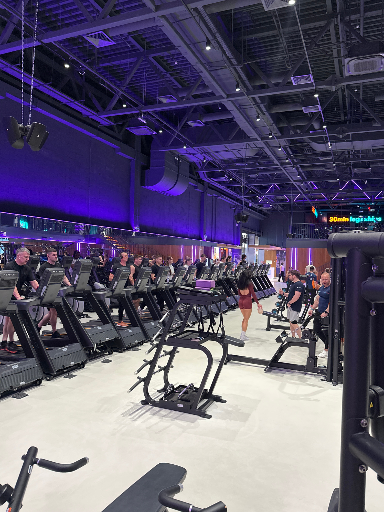 The image shows the interior of a gym in Murino, Russia. The gym is brightly lit with a modern design featuring exposed metal beams and purple accent lighting on the walls and ceiling. A row of seated…read more