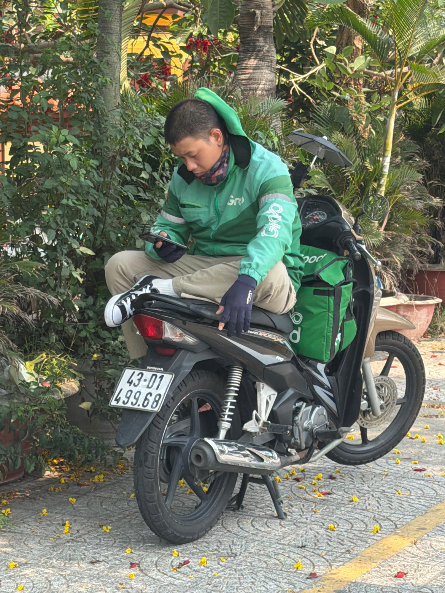 A man wearing a green jacket and light-colored pants sits on a black motorcycle near a tree and a paved sidewalk. The motorcycle's license plate reads "43-01 499.68." The man is wearing black and whit…read more