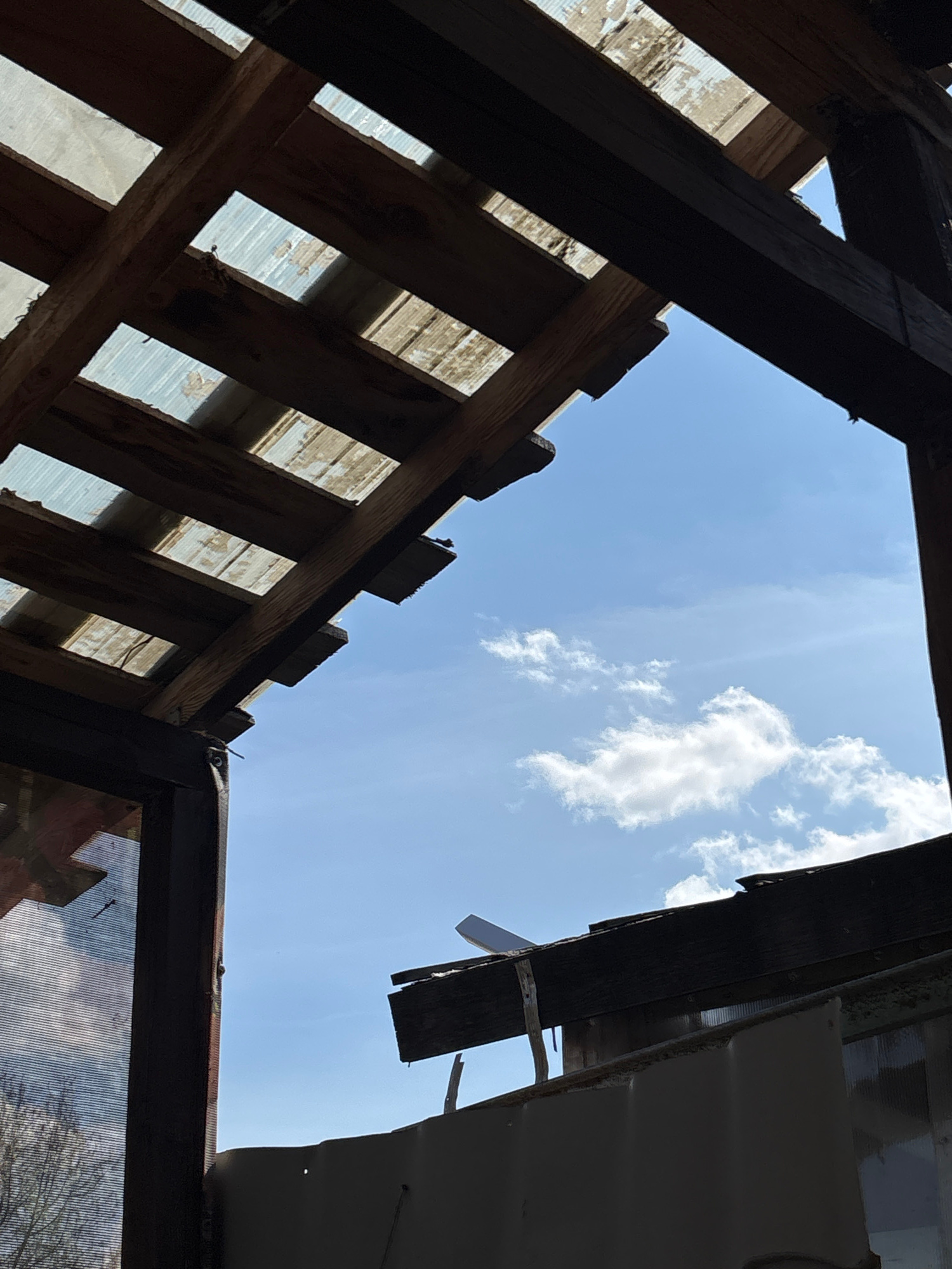 This upward-angled photograph captures a bright blue sky adorned with scattered white cumulus clouds, framed by the dark, silhouetted remnants of a dilapidated or unfinished structure. The perspective…read more