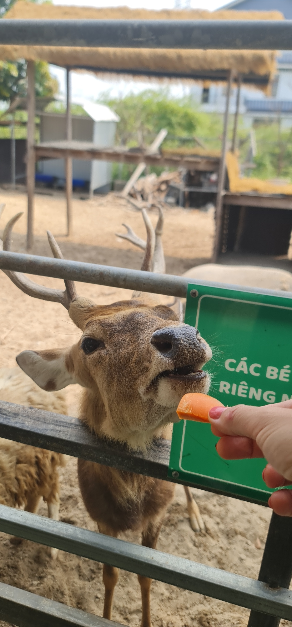 The image, rotated 90 degrees counter-clockwise, depicts a close-up interaction between a human and a deer at an animal enclosure, likely a zoo or wildlife park in Đà Nẵng, Vietnam. A human hand, with…read more
