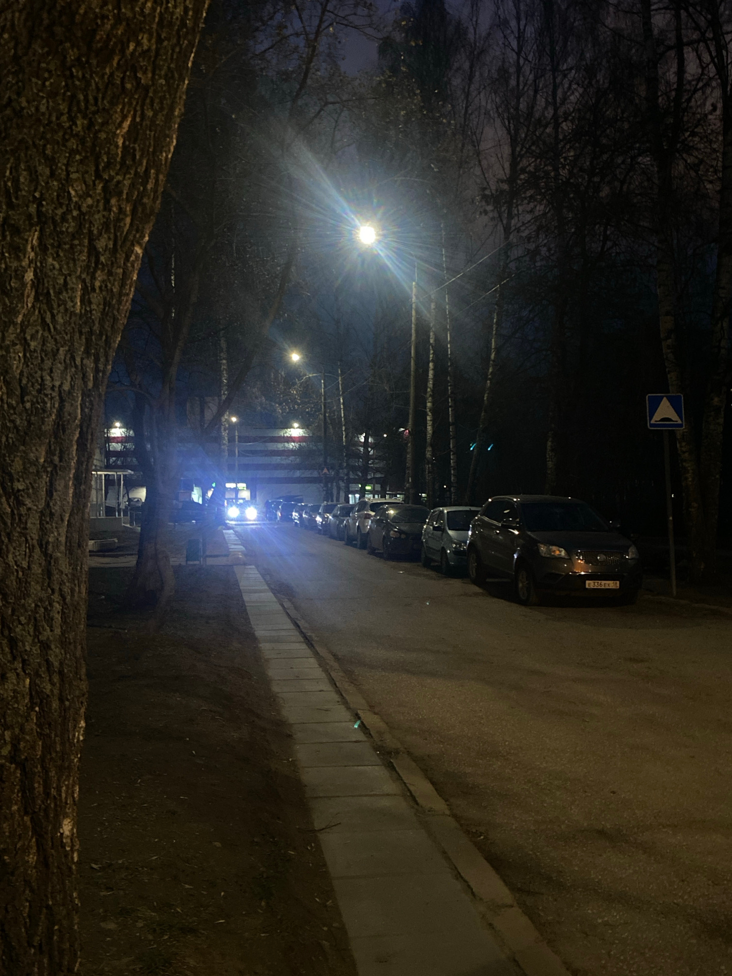 The image depicts a street scene in Izhevsk, Russia, at night. Cars are parked along the right side of the road, illuminated by streetlights. A blue and white road sign is visible near the cars. A tre…read more