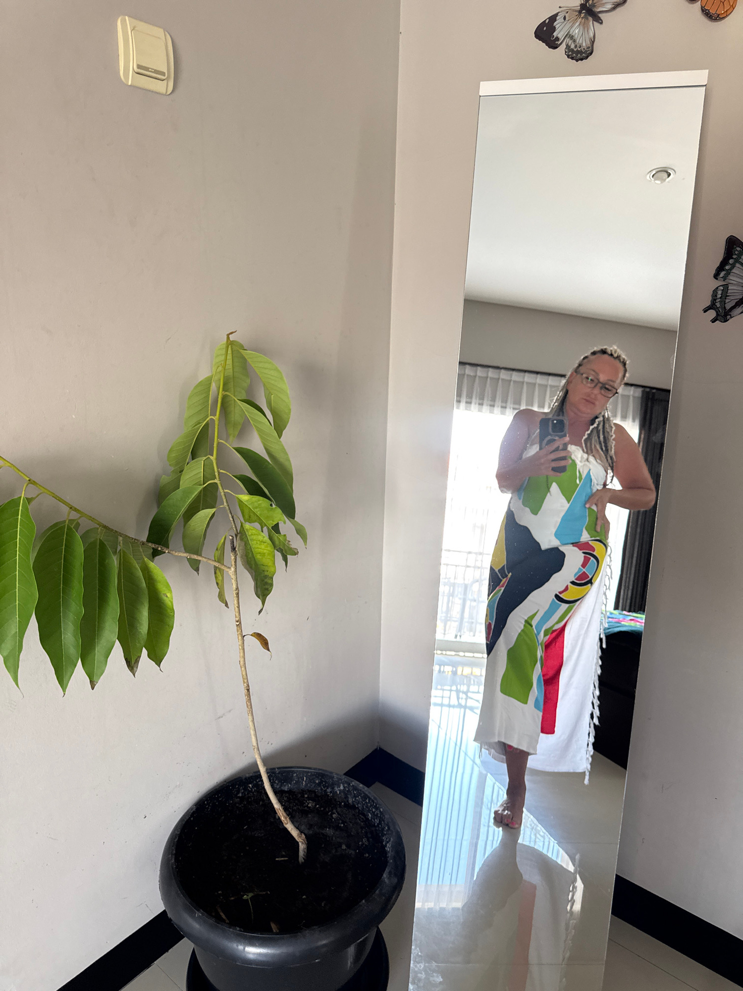 The image shows a woman's reflection in a mirror. The woman is wearing glasses, a dress with a colorful pattern, and has blonde braided hair. She is holding a smartphone and taking a selfie. In the fo…read more