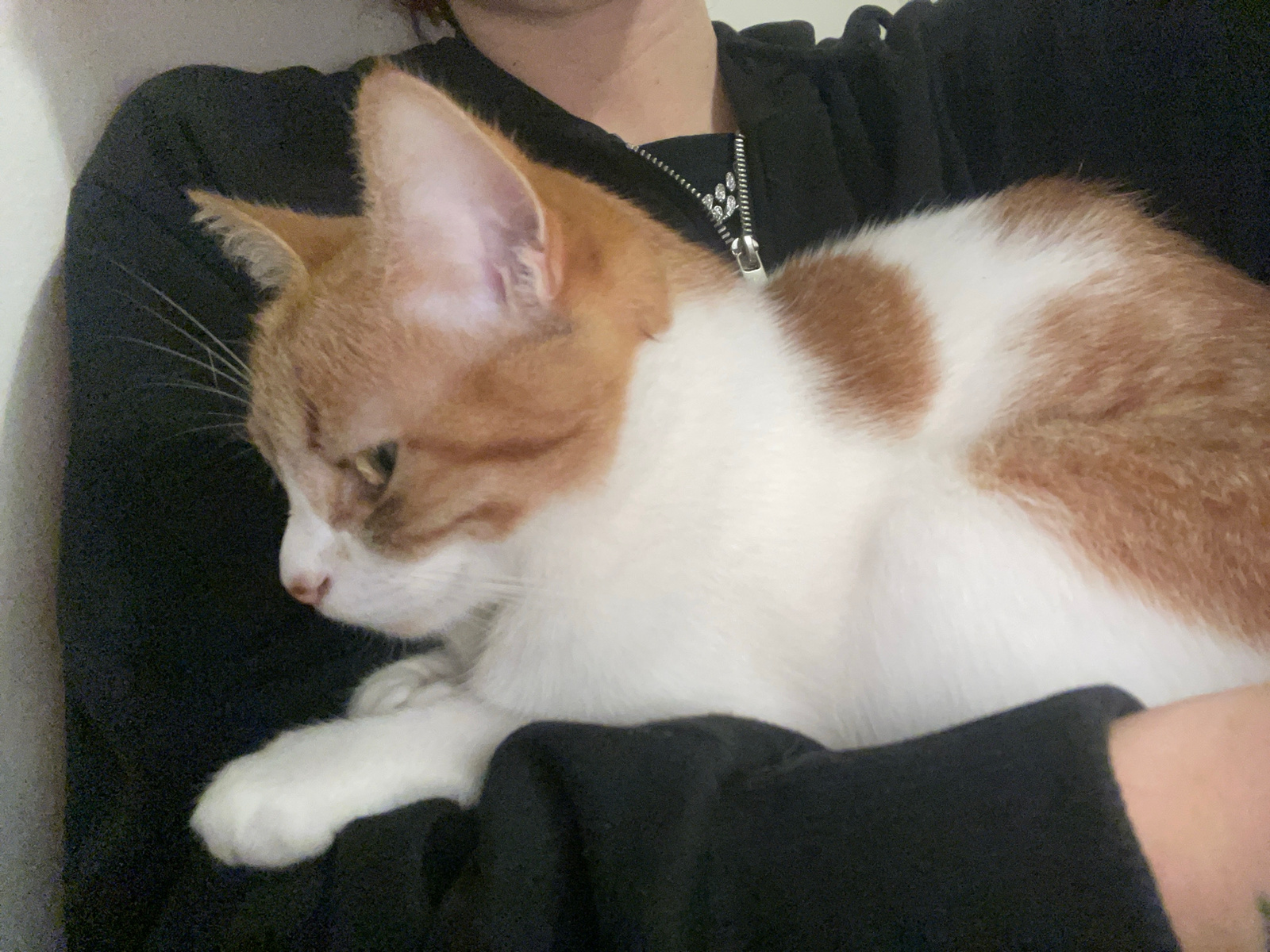 A person is holding a cat. The cat is white and orange. The person is wearing a black hooded sweatshirt. The scene is indoors. There is no indication of Buenos Aires, Argentina.