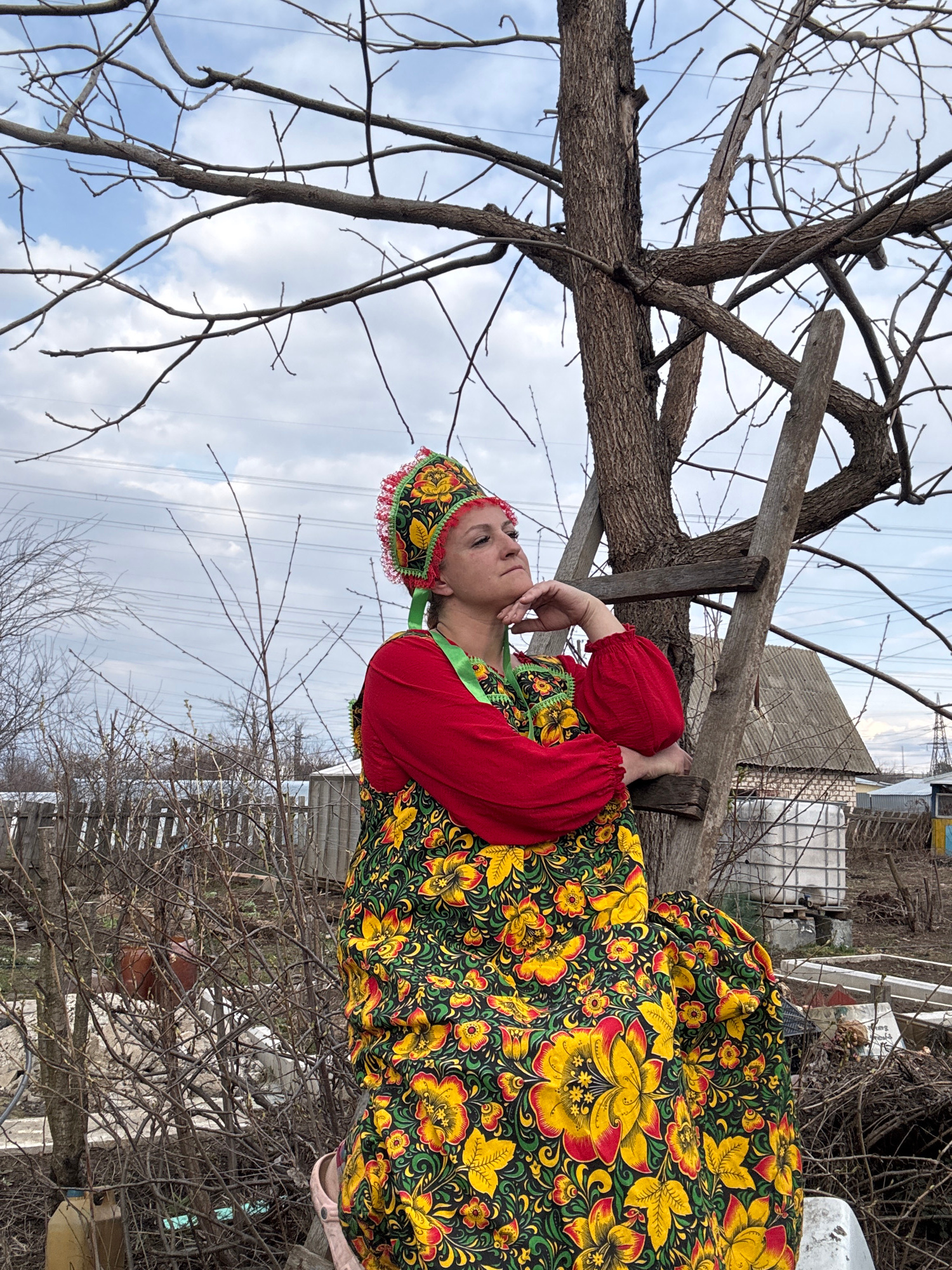 A woman in traditional Russian clothing sits on a wooden ladder propped against a tree in what appears to be a rural or semi-rural area. The woman is wearing a colorful floral dress and a matching hea…read more