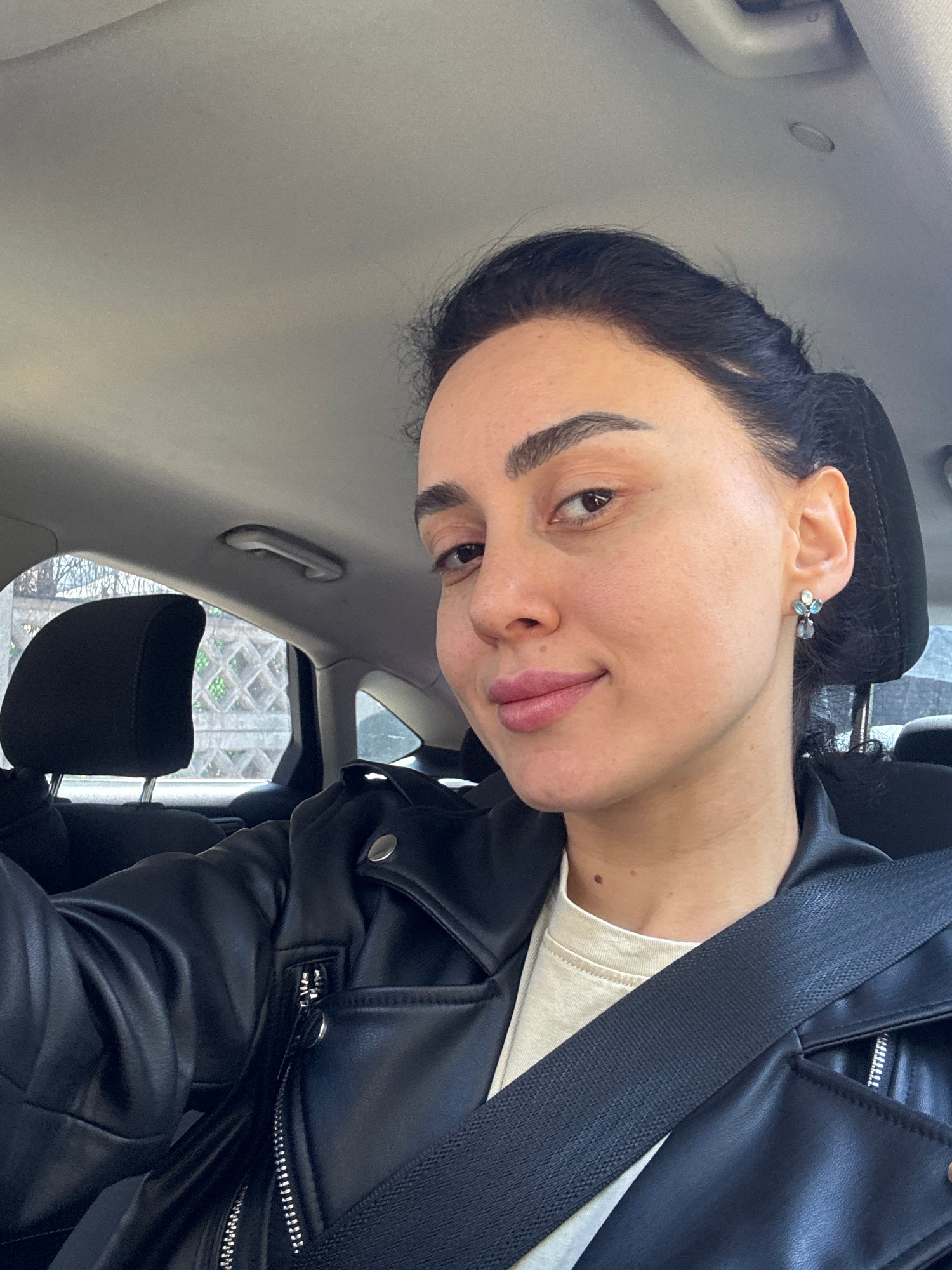 A woman is in a car wearing a black leather jacket and a white shirt. She is wearing a seatbelt and facing the camera. The location is Tbilisi, Georgia, as evidenced by the distinct architectural patt…read more