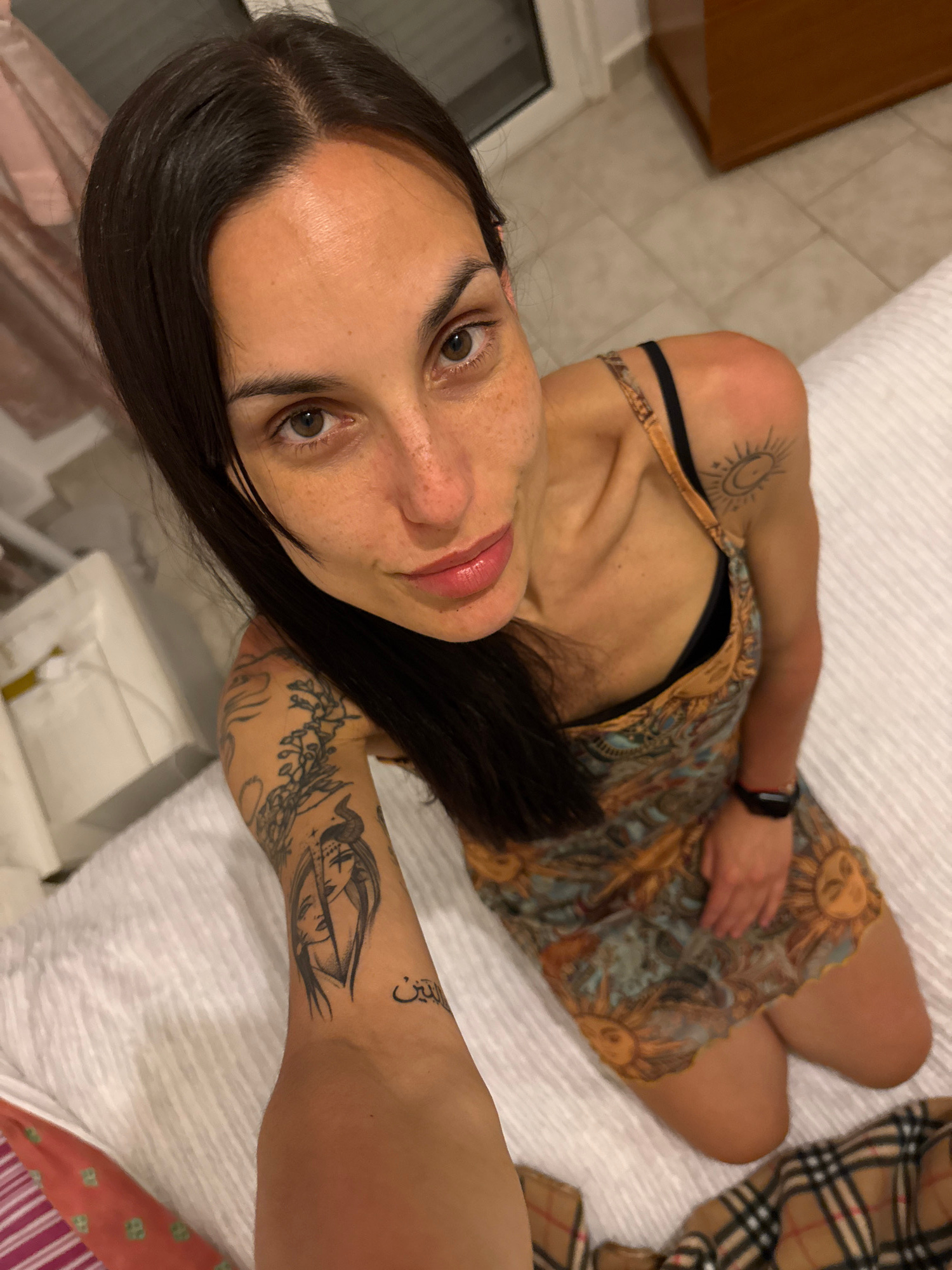 A woman is lying on a bed covered in white bedding, likely indoors. She is fair-skinned with brown hair and visible freckles on her face. She is wearing a short patterned dress with what appears to be…read more
