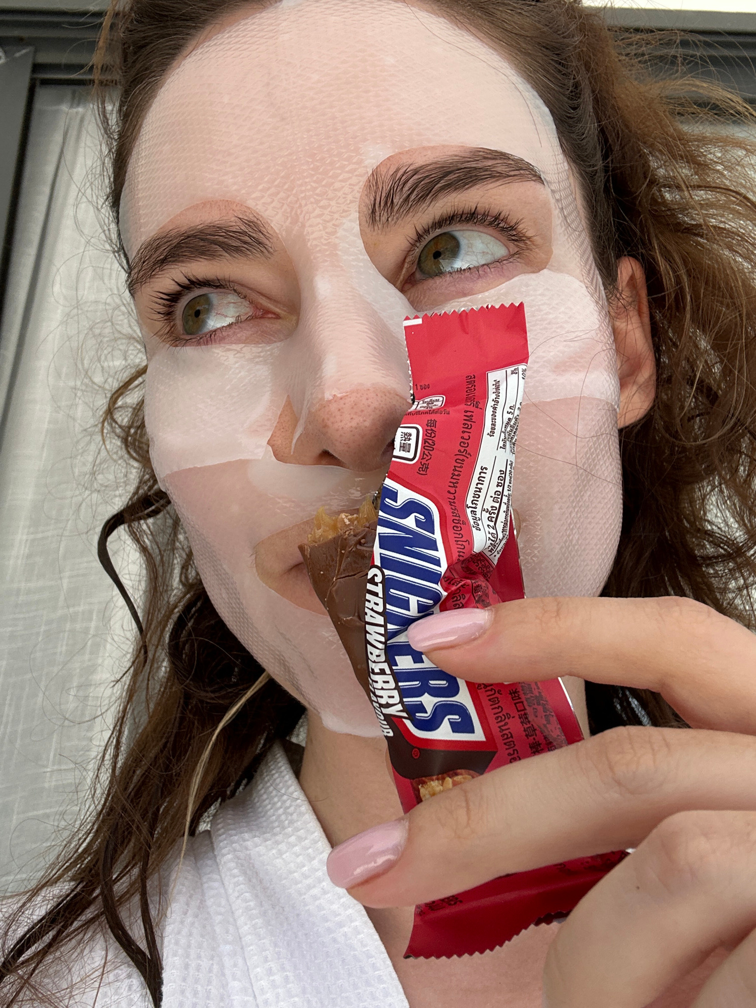 A female individual, located in Choeng Thale, Thailand, is captured in a close-up, chest-up view within an indoor setting. She wears a white terrycloth bathrobe and a light-toned sheet facial mask, wh…read more