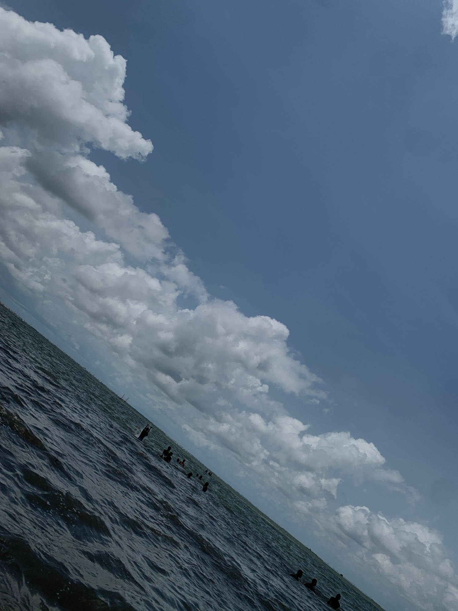 The image depicts a body of water under a partly cloudy sky, likely taken in Ikorodu, Nigeria. The water surface is textured with ripples, suggesting a slight breeze. Dark shapes, possibly birds or ot…read more