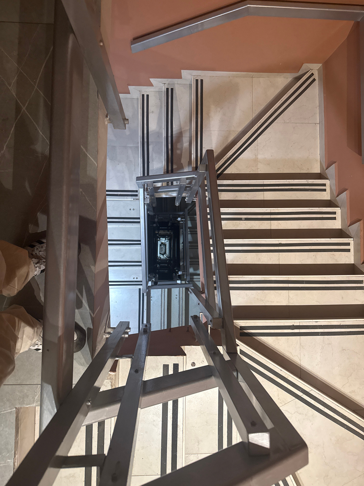 A high-angle, slightly distorted perspective depicts a stairwell in what appears to be Mexico City, Mexico. The staircase descends into a deep shaft, where the steps are lined with light-colored tiles…read more