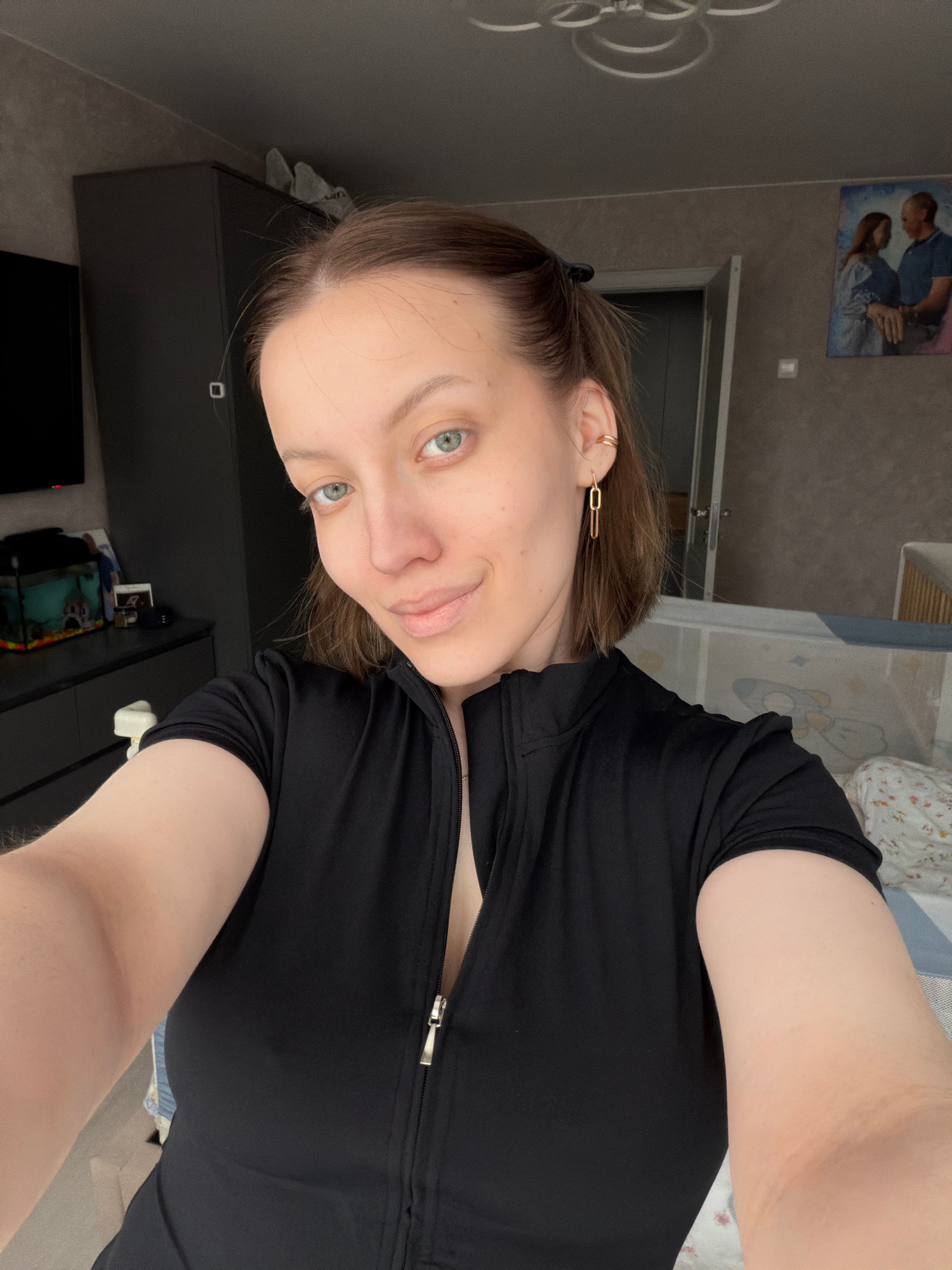 An indoor selfie captures a woman looking directly at the camera with a slight smile. She has light-colored eyes (blue/green) and brown hair. Her left ear is adorned with two small hoop piercings on t…read more