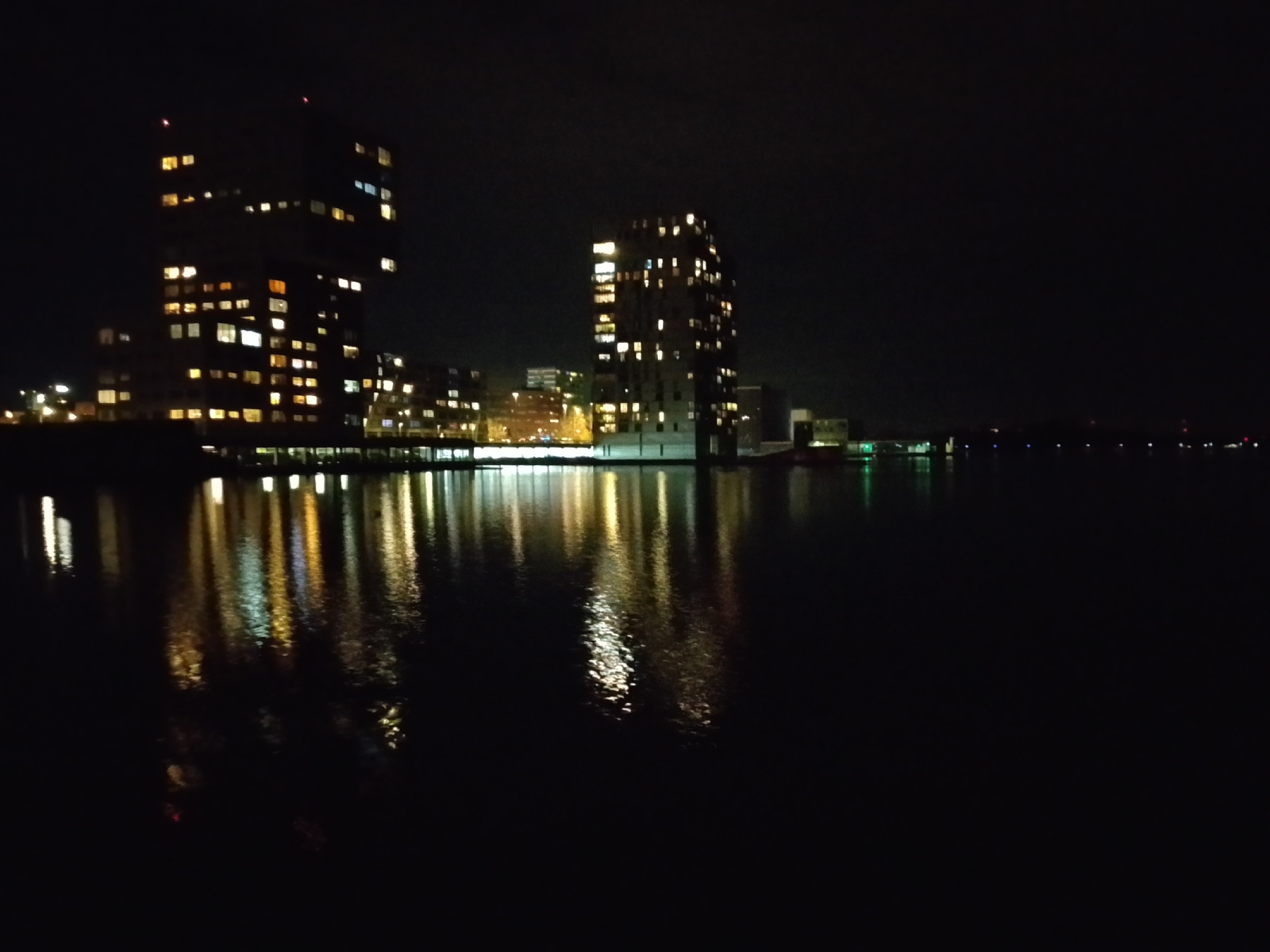The image depicts a nighttime view of buildings reflected in water, likely a lake or river. Two prominent high-rise buildings are illuminated with numerous lights visible in their windows. Other build…read more