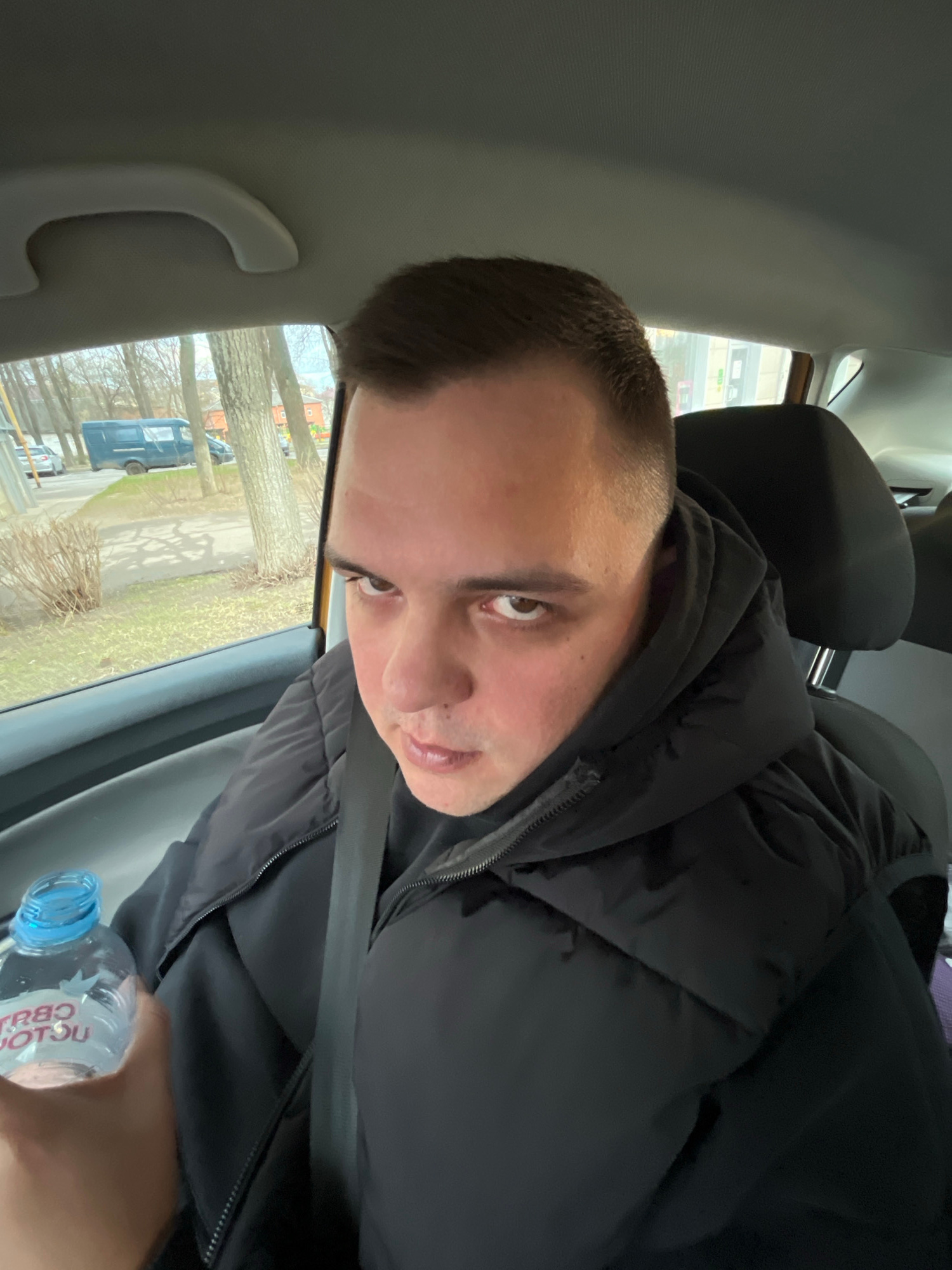 A man is seated in the passenger seat of a car, wearing a black hooded puffer jacket and a seatbelt. He is holding a bottle of water in his right hand. Outside the car window is a view of a street in…read more
