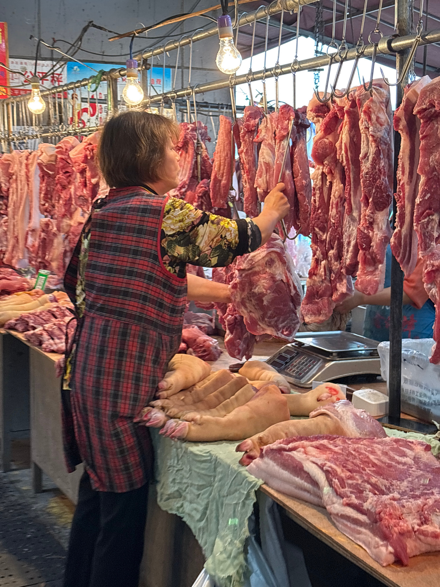 In Jiangjin, China, a middle-aged woman with short gray hair stands in a butcher shop, wearing a red and black plaid apron over a floral-sleeved shirt, with black pants. She reaches up to handle a lar…read more