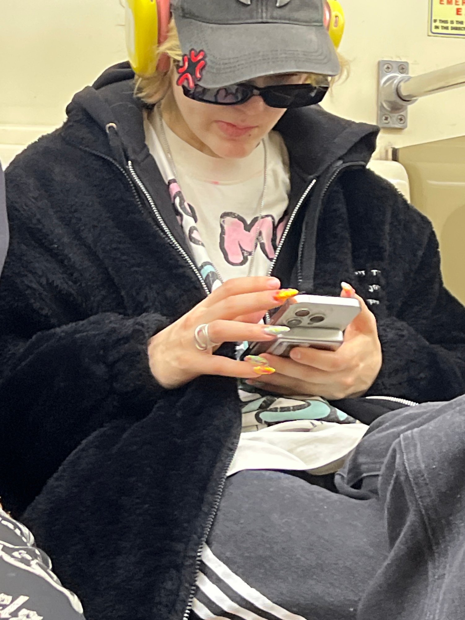 A person with light blonde hair is sitting in a public transportation seat, possibly a train, as indicated by the overhead grab bar and the cream-colored wall behind them. They are wearing a gray base…read more