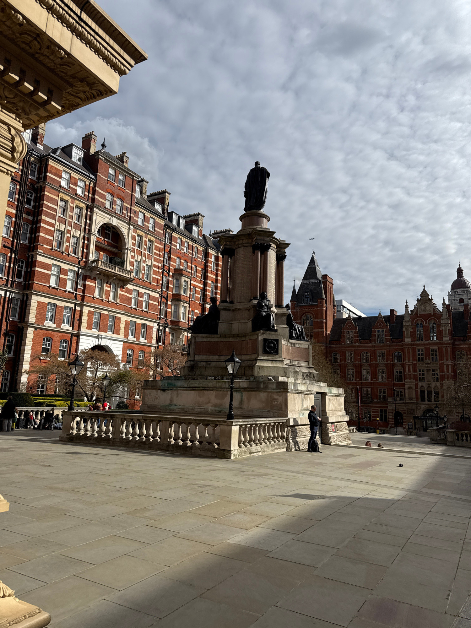 The image depicts Parliament Square in Westminster, London, United Kingdom, under a partly cloudy sky. In the center, the Statue of Lord Palmerston stands prominently. The bronze statue of a male fig…read more