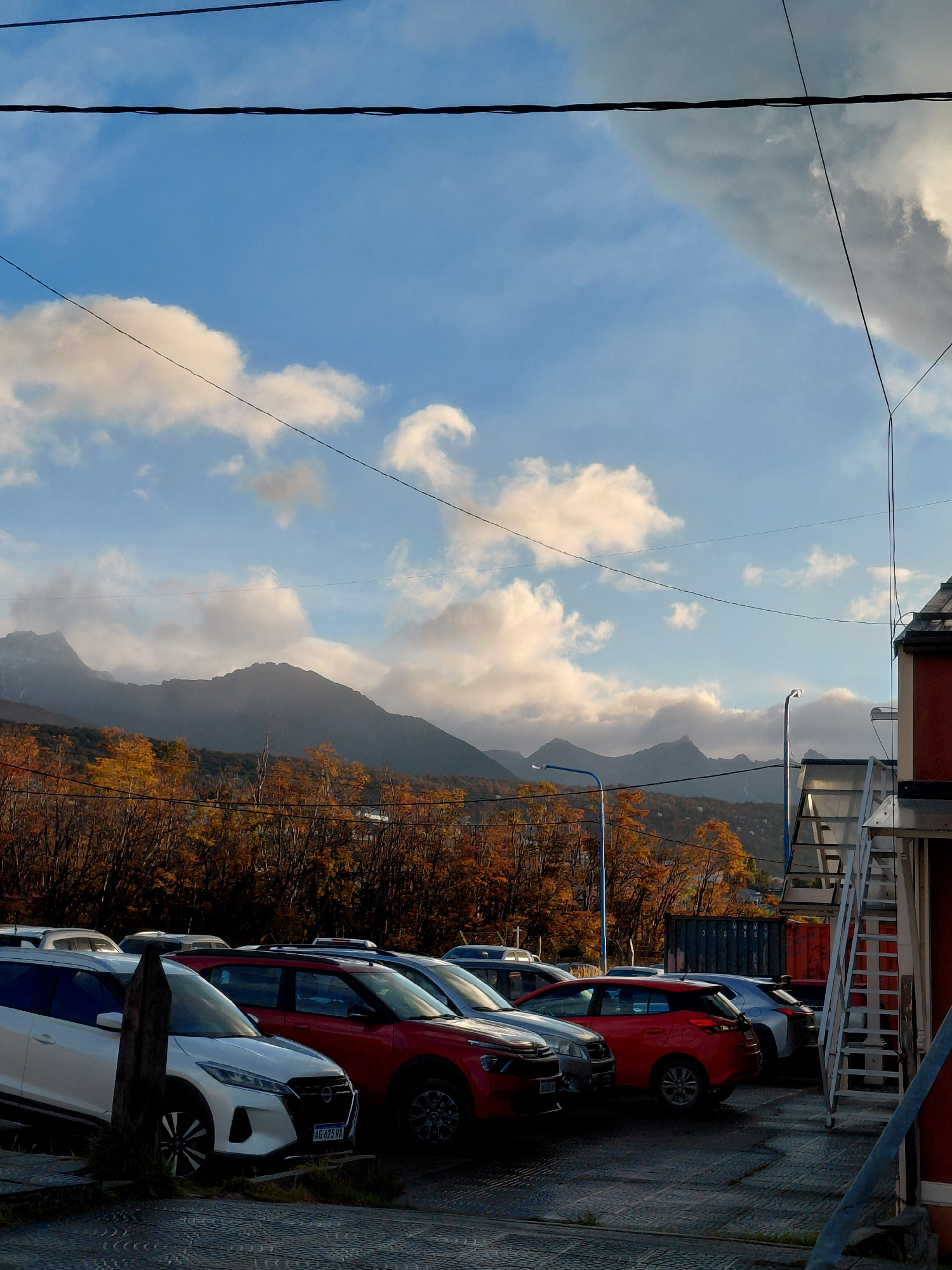 The image shows a street scene in Ushuaia, Argentina. The view is oriented vertically. On the right side of the frame, a row of parked cars lines the street, including a red, grey, and white car. Thes…read more