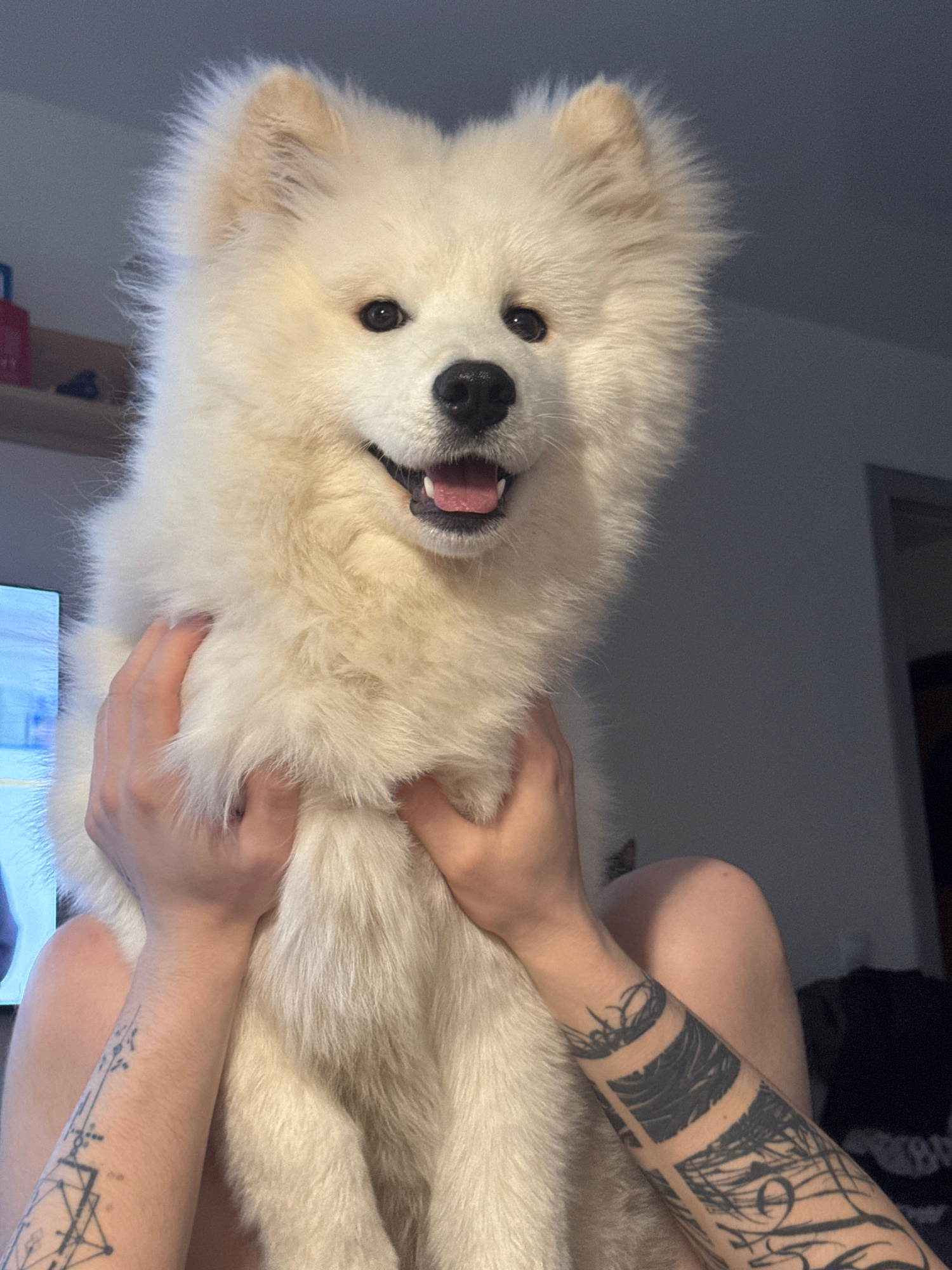 A medium-shot photograph shows a light-skinned person sitting and holding a white Samoyed dog. The dog's face is close to the camera, with its mouth slightly open. The person has tattoos on both arms.…read more