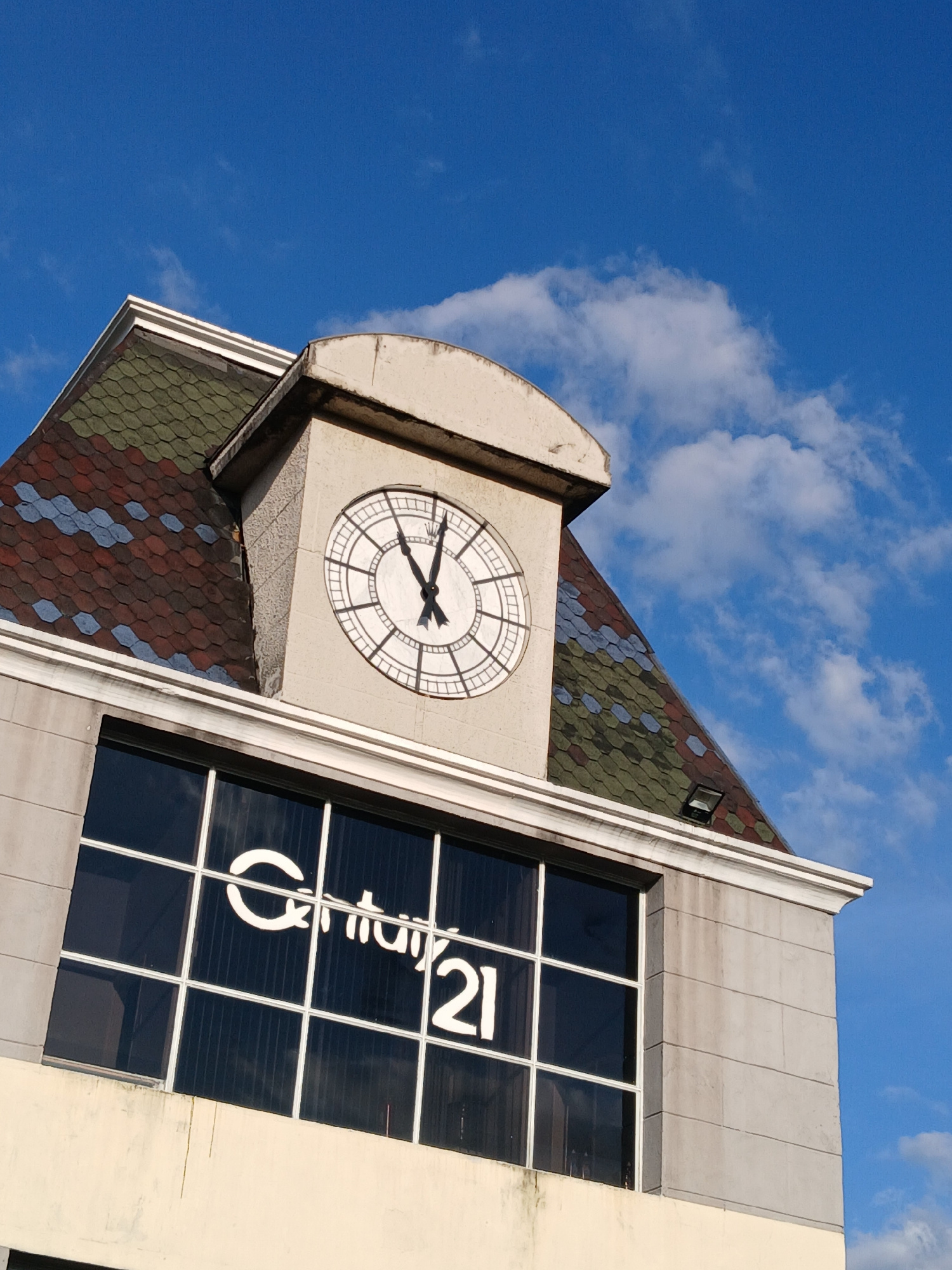 The image captures a low-angle view of a building in Guayana City, Venezuela, under a partly cloudy blue sky. The building features a clock tower with a visible clock face showing a time around 8:49.…read more