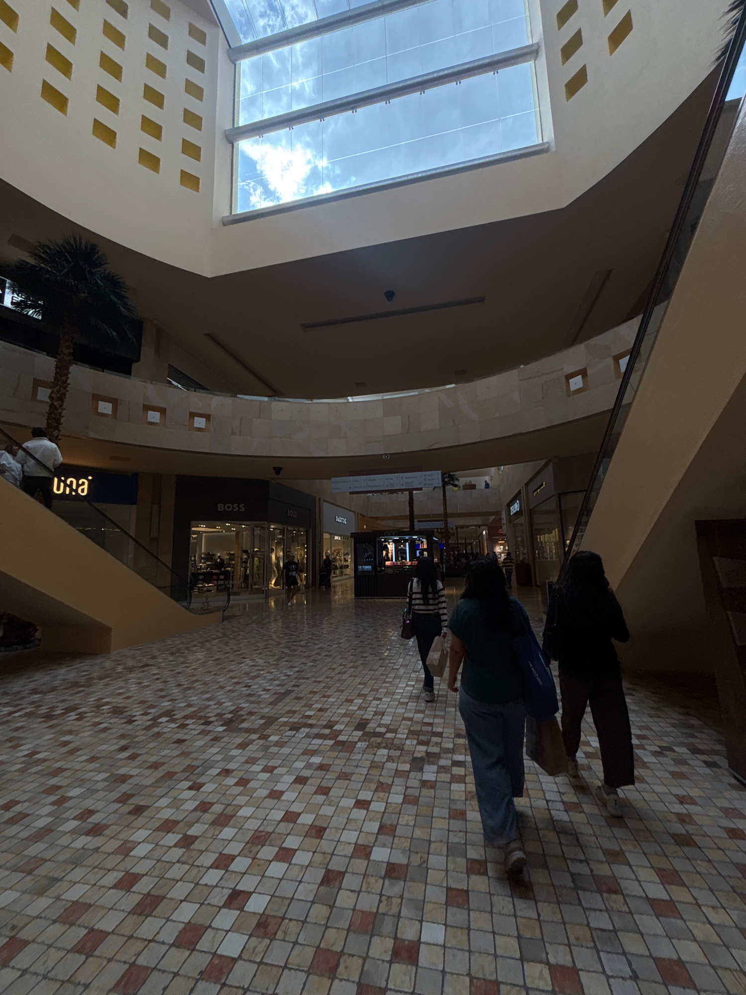 The image shows the interior of what appears to be a shopping mall, likely located in Puebla, Mexico, given the provided context. The architecture features a large skylight, allowing natural light to…read more