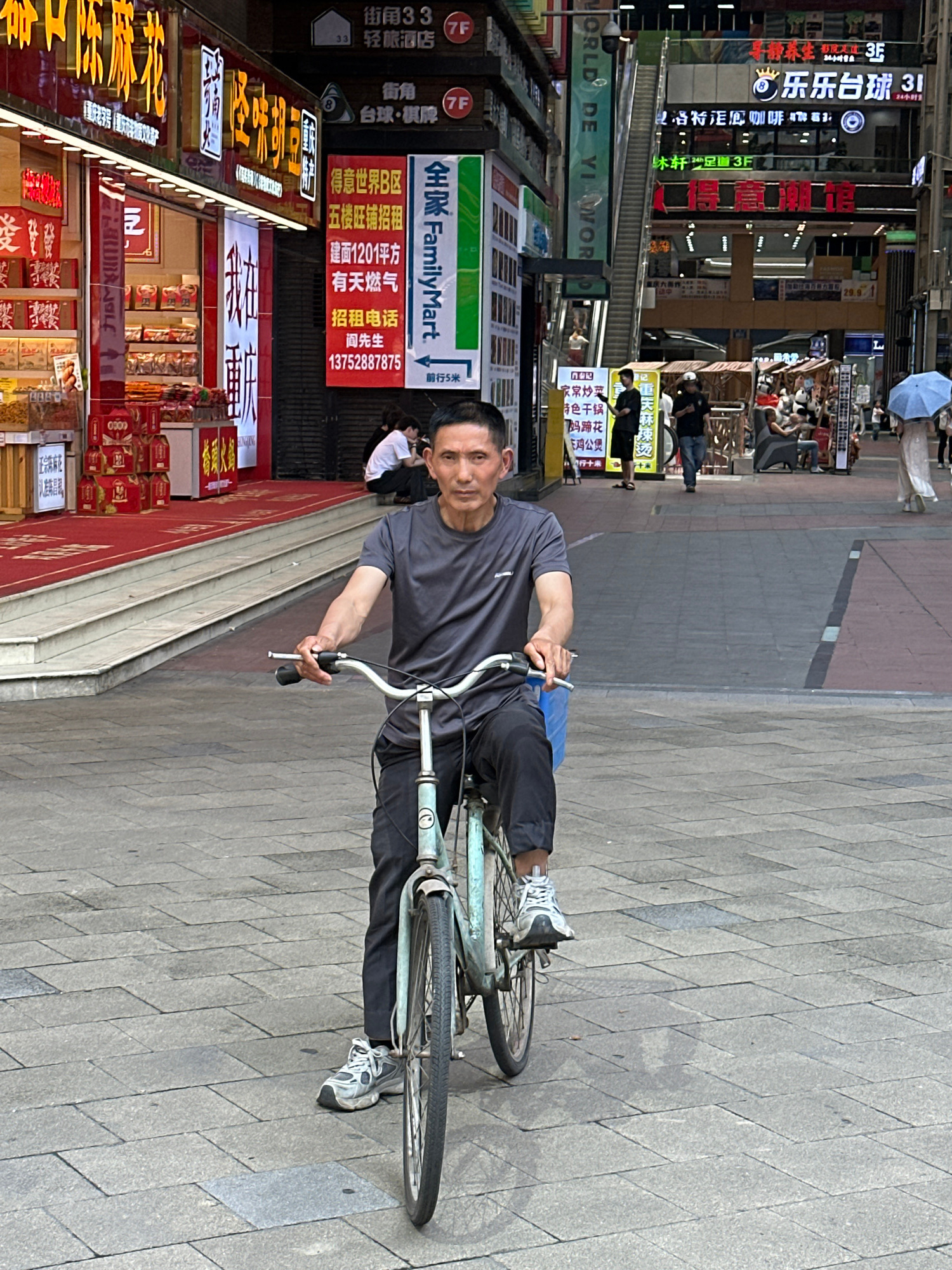 A man is riding a bicycle on a brick-paved sidewalk. He is wearing a gray shirt and black pants, and he is looking at the camera. In the background, there is a street with shops and signs, including a…read more