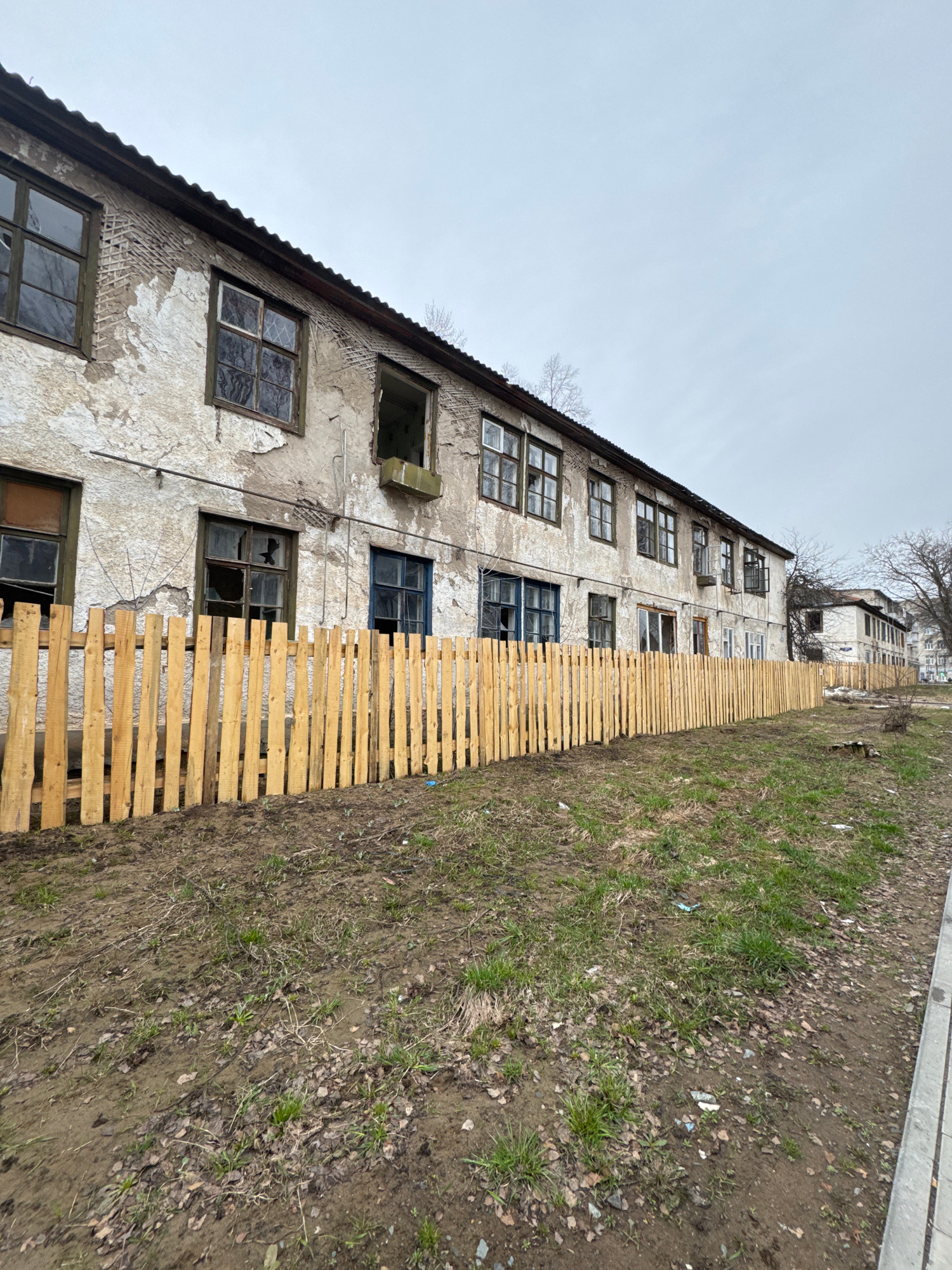 The image shows a derelict, multi-story building in Chaikovsky, Russia. Its facade is heavily weathered with crumbling plaster revealing underlying brickwork. Many windows are broken or missing, expos…read more